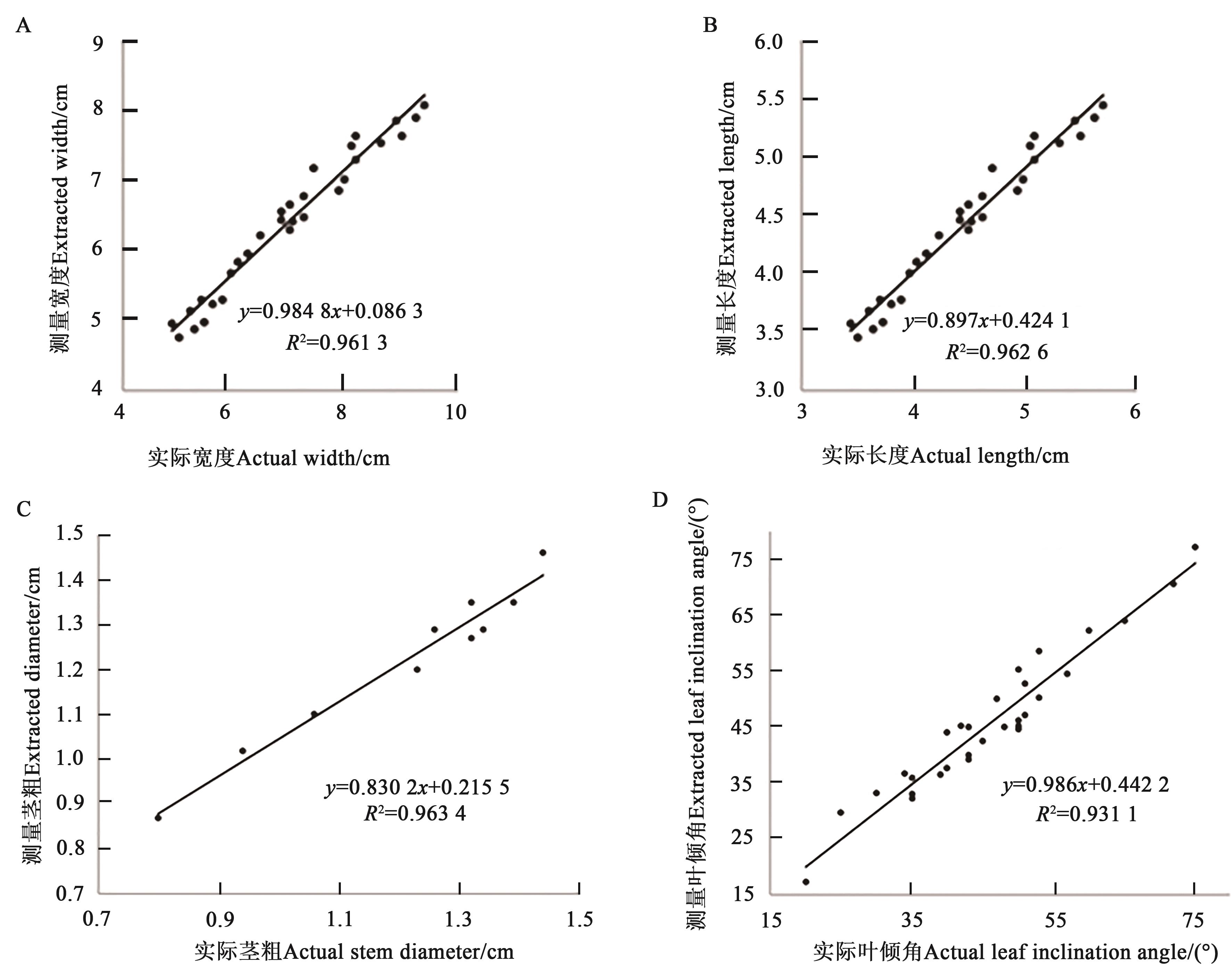 Fig. 10 Comparison of soybean phenotypic parameters extracted with actual valuesA:Leaf width; B:Leaf length; C:Stem diameter; D: Leaf inclination angle