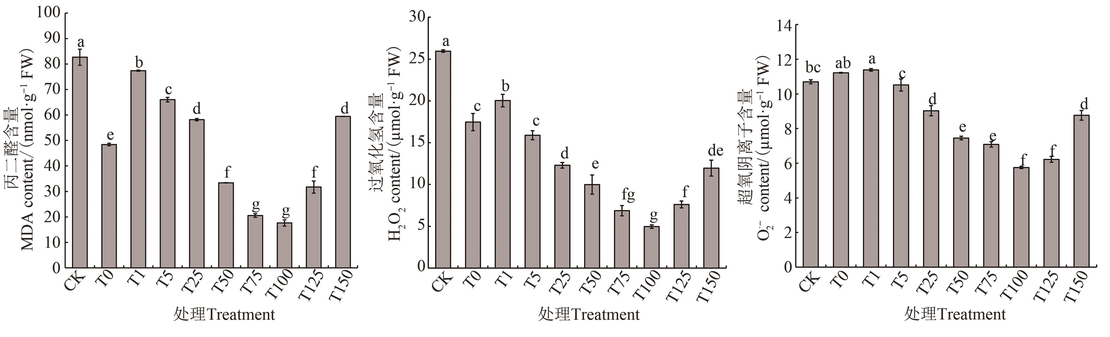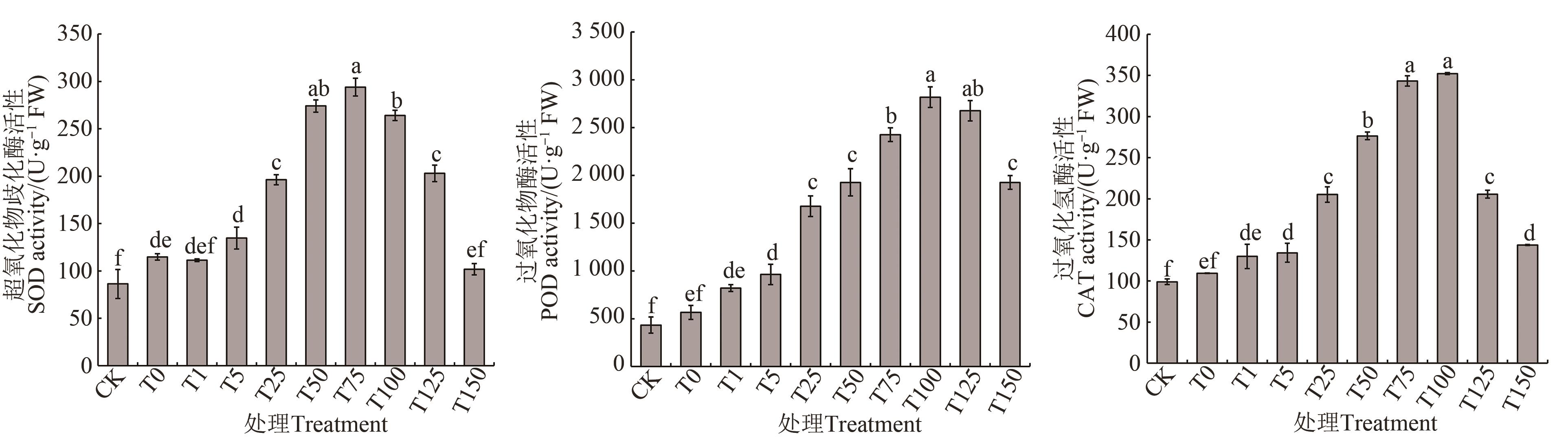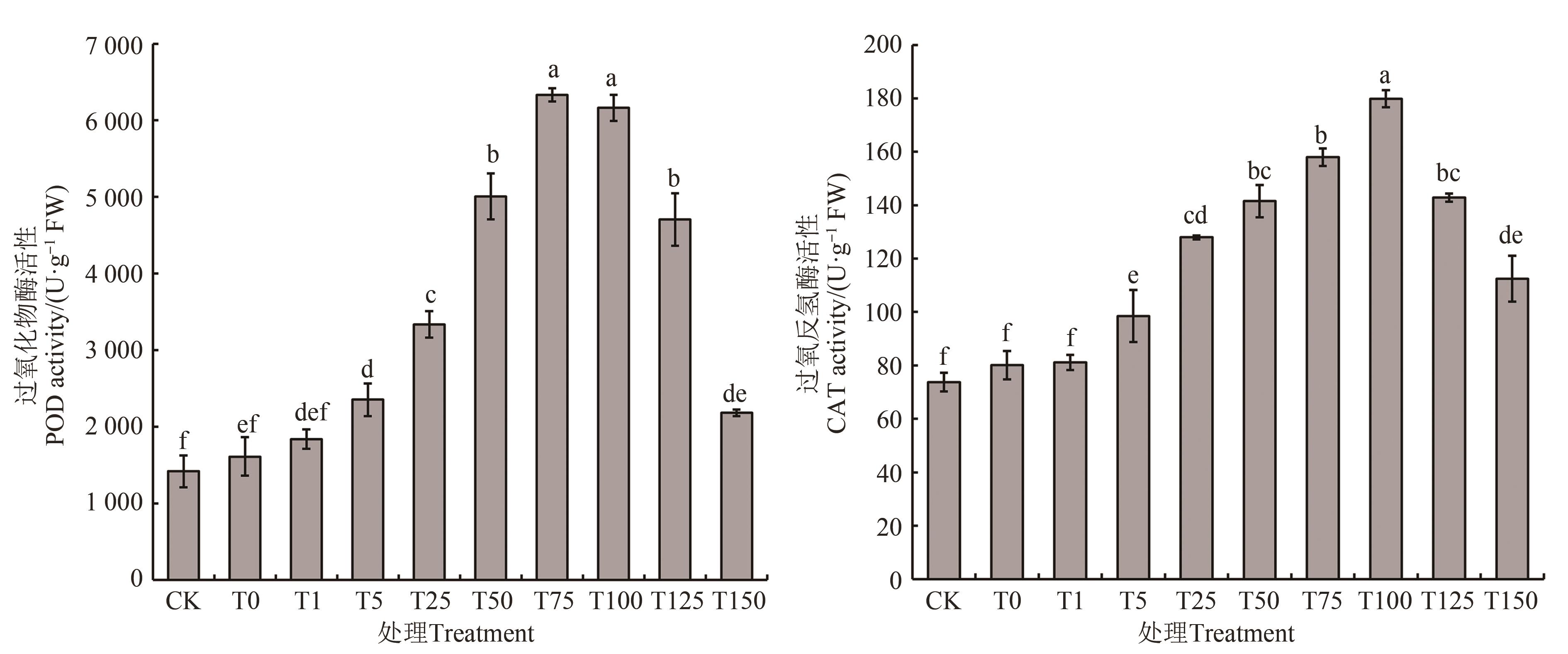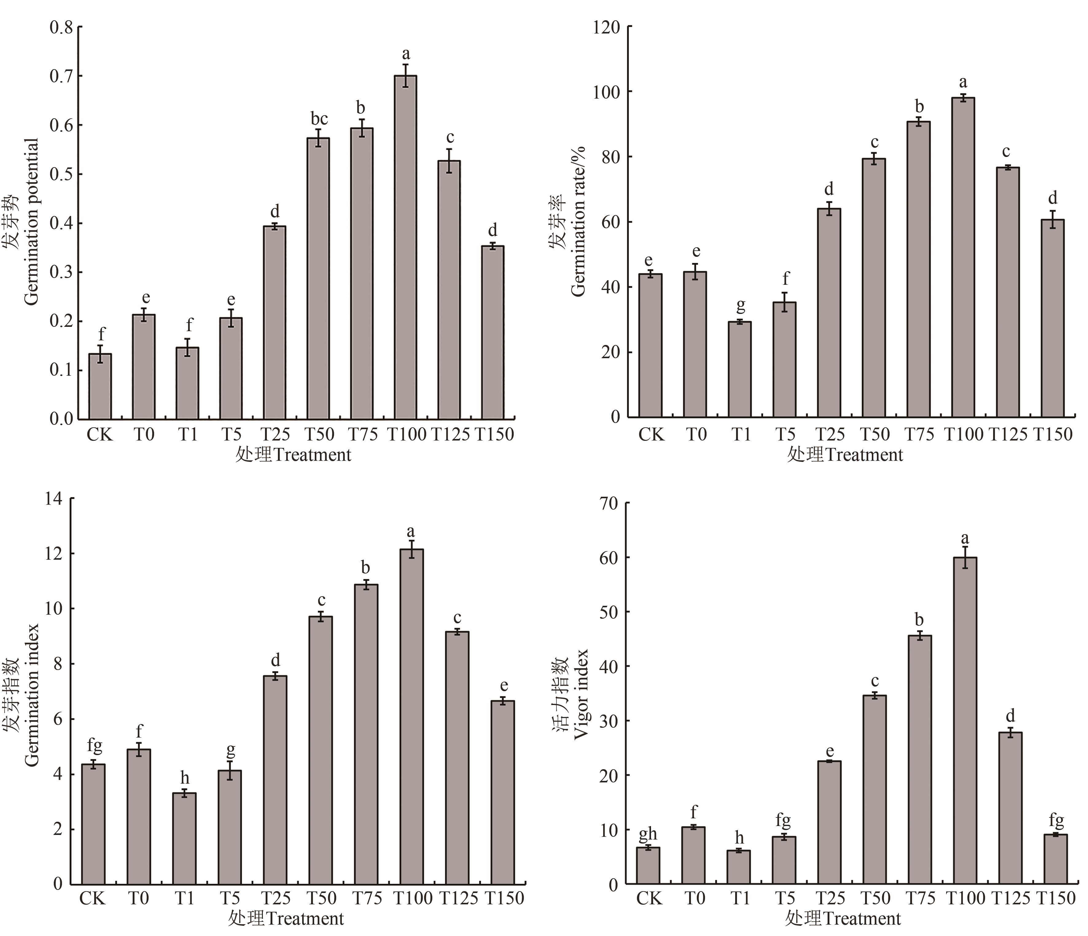 为提高干旱胁迫下朝天椒种子的萌发势和幼苗生长势,采用1、5、25、50、75、100、125、150 μmol·L-1的褪黑素溶液对朝天椒种子进行引发处理,用10% PEG溶液模拟水分胁迫,分析朝天椒种子萌发和幼苗生长状况及其生理变化。结果表明,与未引发种子相比,100 μmol·L-1褪黑素溶液引发的朝天椒种子在干旱胁迫下发芽势、发芽率、发芽指数和活力指数显著增加425.01%、122.73%、178.55%和796.93%;干旱胁迫下朝天椒幼苗的全长、根长、株高、鲜重、根鲜重、地上鲜重和植株干重显著增加146.70%、221.74%、70.00%、48.88%、121.66%、39.38%和285.71%。生理分析表明,100 μmol·L-1褪黑素溶液引发的种子的过氧化氢酶(catalase,CAT)活性、抗坏血酸过氧化物酶(ascorbate peroxidase,APX)活性和可溶性糖(soluble sugar,SS)含量最高,丙二醛(malondialdehyde,MDA)和过氧化氢(hydrogen peroxide,H2O2)含量最小;100 μmol·L-1褪黑素引发的种子在干旱胁迫下萌发后,幼苗的过氧化物酶(peroxidase,POD)活性、CAT活性、APX活性、SS、可溶性蛋白(soluble protein,SP)和脯氨酸(proline,Pro)含量最大;MDA和活性氧类(reactive oxygen species,ROS)含量最低。以上结果表明,使用100 μmol·L-1的褪黑素溶液对朝天椒种子进行引发处理,能够促进种子在干旱胁迫下的萌发和生长。研究结果可为朝天椒耐旱栽培和育种提供参考。