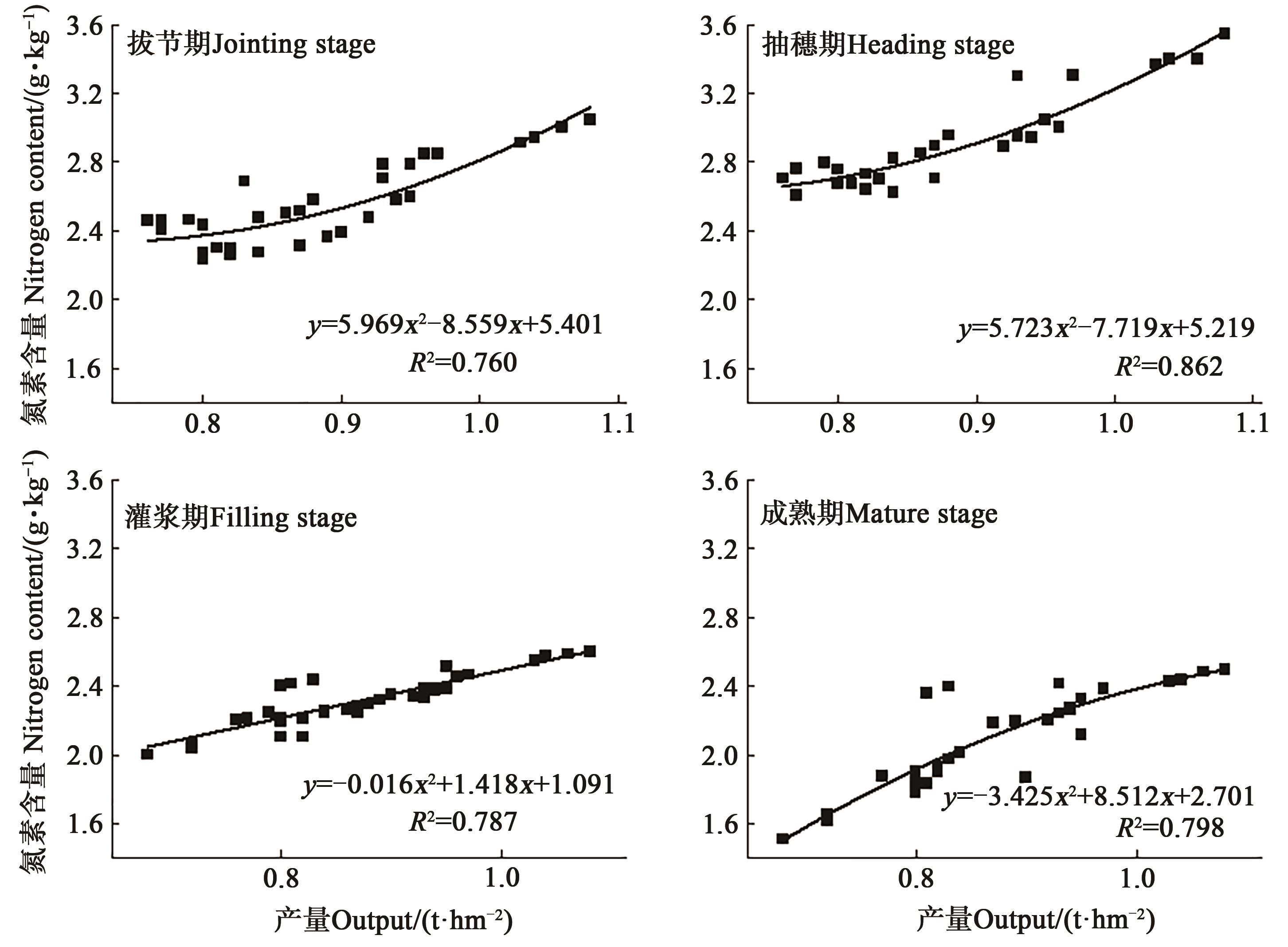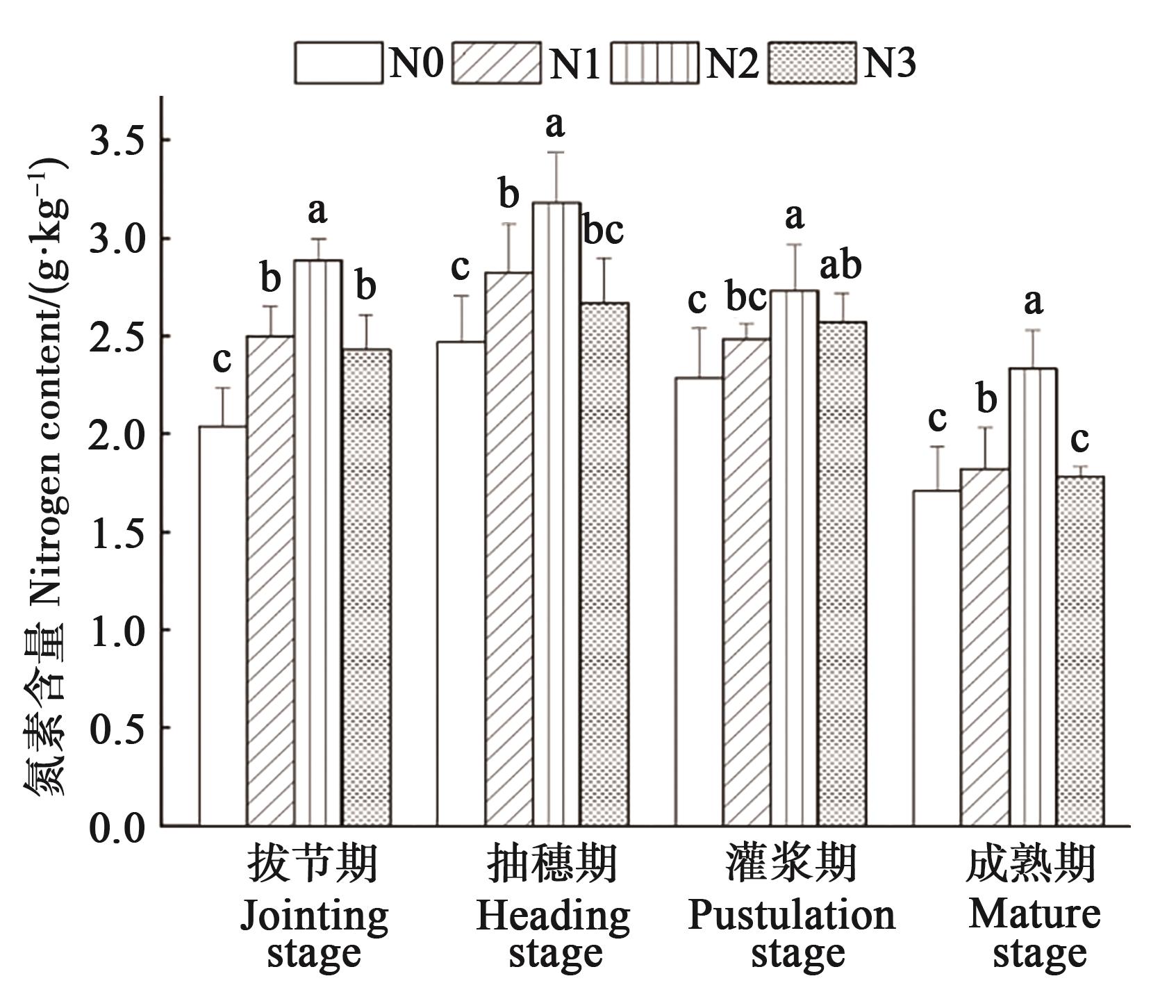 Fig. 2 Nitrogen content in millet canopy under different nitrogen treatments at each growth stageDifferent lowercase letters indicate significant differences between different treatments in same stage at P<0.05 level.
