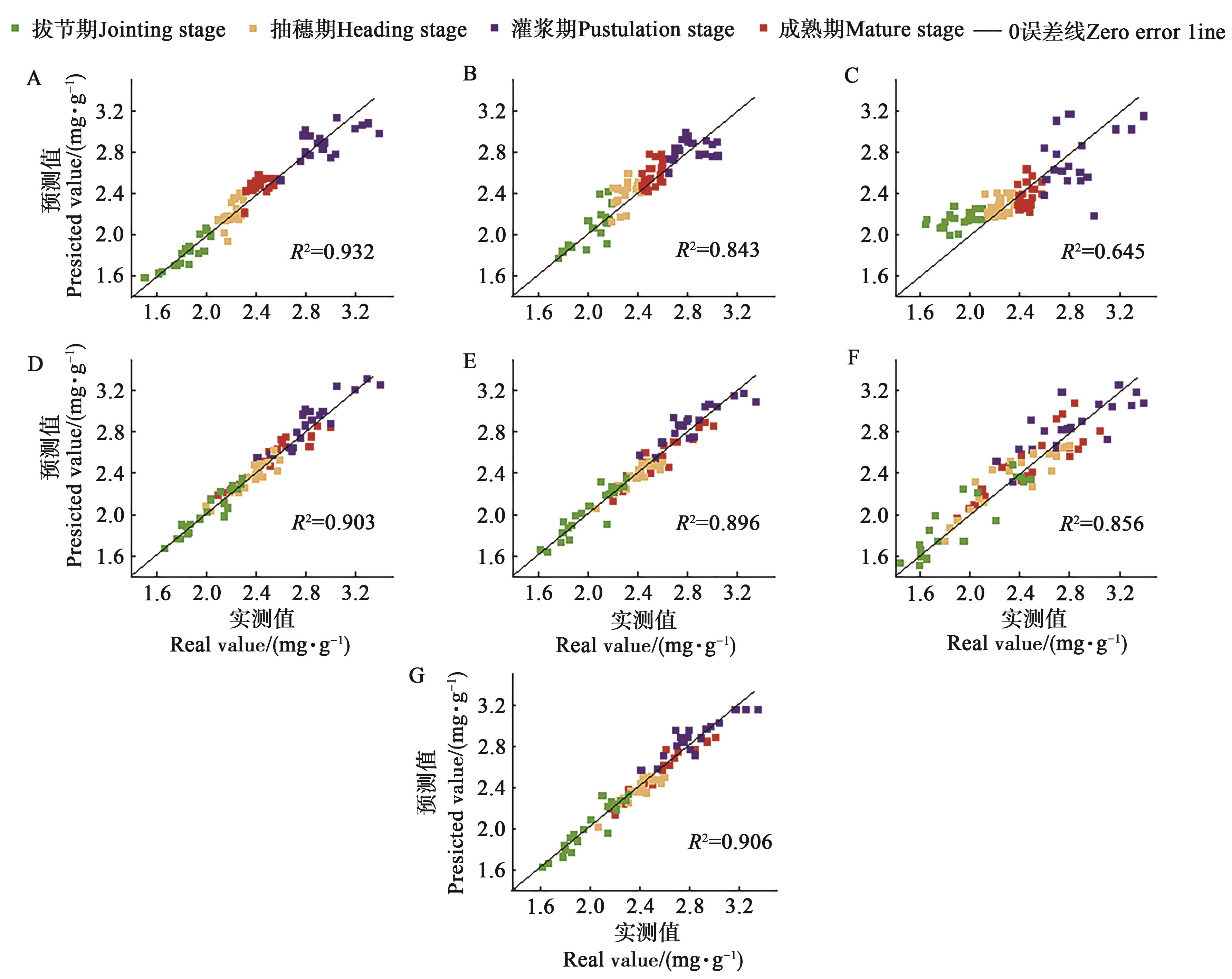 Fig. 5 Measured value and predicted value of PLSR modelA: Sensitive waveband; B: Vegetation Index; C: Hyperspectral characteristic parameters; D: Sensitive waveband and vegetation index; E: Sensitive waveband and hyperspectral characteristic parameters; F: Vegetation index and hyperspectral characteristic parameters; G: Sensitive waveband, vegetation index and hyperspectral characteristic parameters