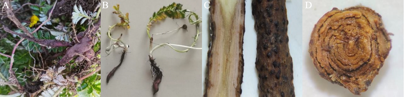 Fig. 1 Field symptoms of Potentilla anserina L. root rot infectionA: Symptoms of disease in the field;B: Whole plant of diseased Potentilla anserina L.;C: Longitudinal section of diseased root tuber;D: Transverse section of diseased root tuber
