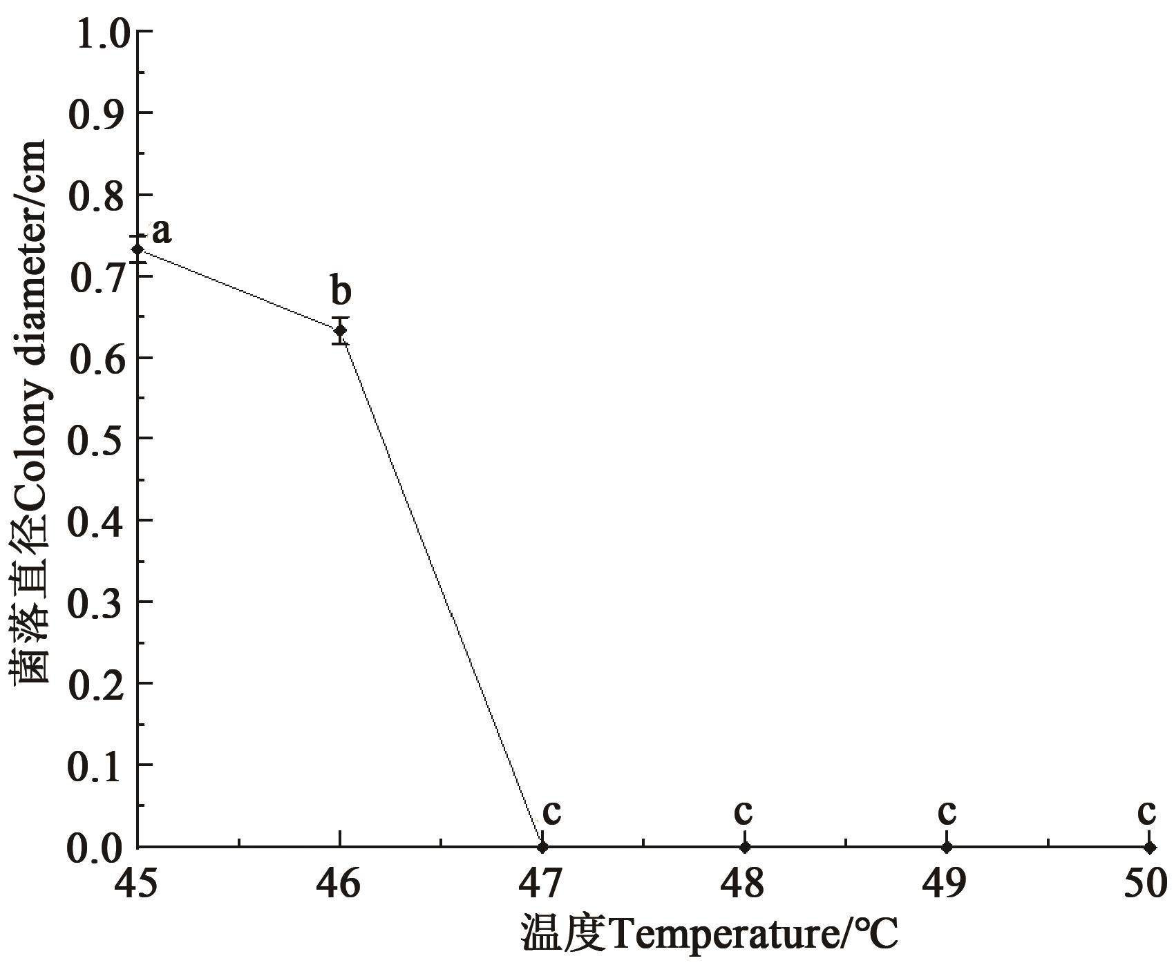 Fig. 7 Fatal temperature of MY-BSX4-1 myceliumNote: Different lowercase letters indicate significant differences between different temperatures at P<0.05 level.