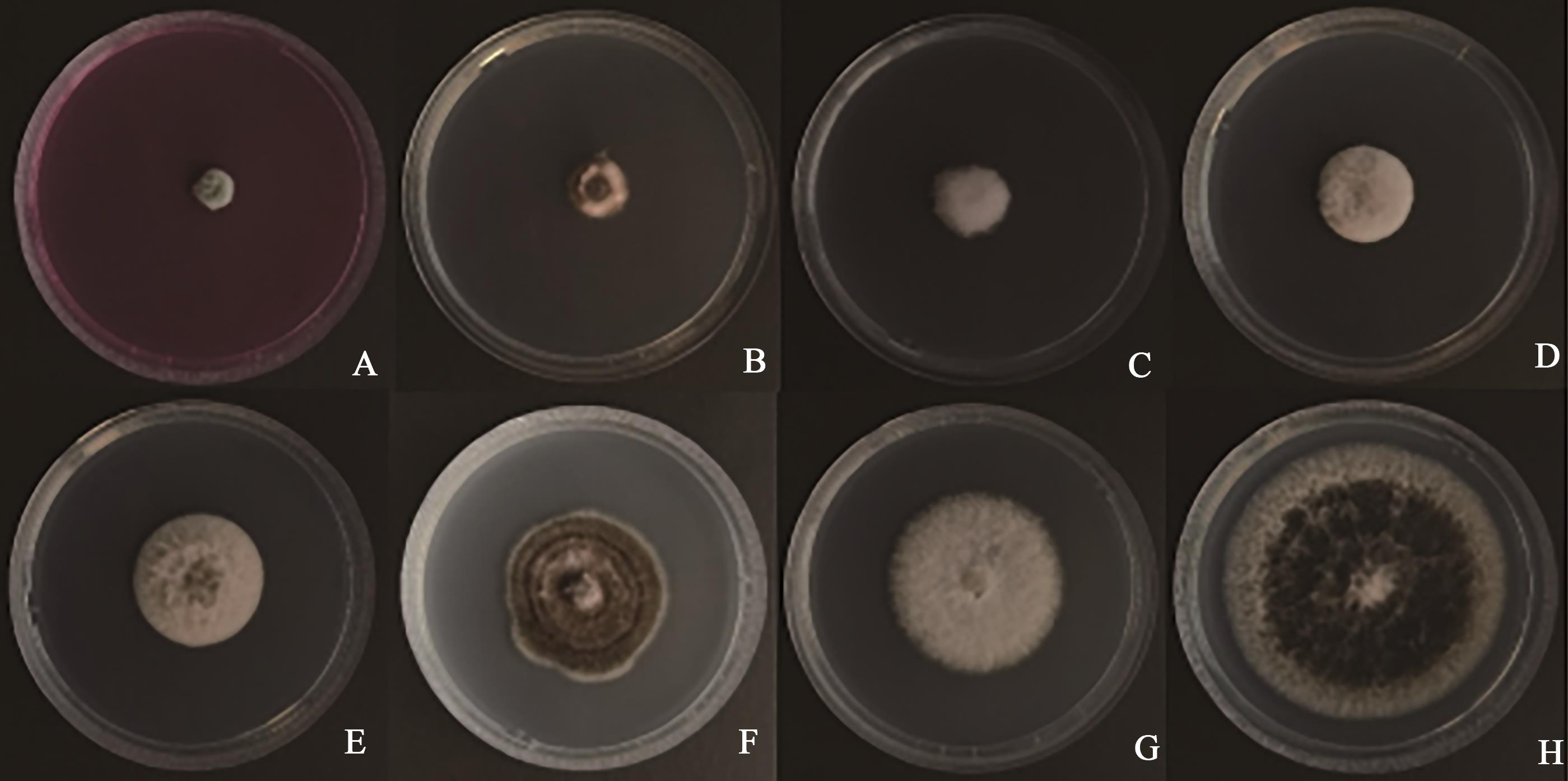 Fig. 2 Growth of A. alternata under different fungicidesA: Fludioxonil; B: Pyrithiamide; C: Difenoconazole; D: Prothioconazole; E: Phenamacril; F: Polyoxin; G: Azoxystrobin; H: CK