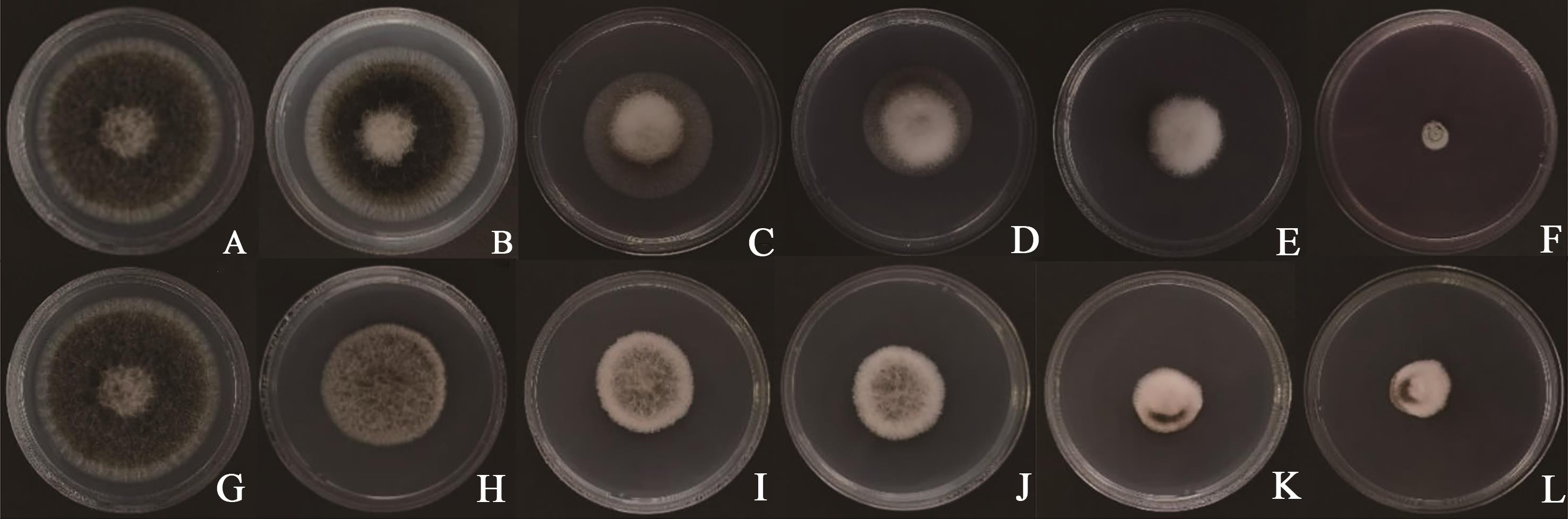 Fig.3 Mycelial growth of A. alternata under different levels of tested fungicidesA: CK; B: Fluoxonil 15.63 mg·L-1;C: Fluoxonil 31.25 mg·L-1; D: Fluoxonil 62.50 mg·L-1; E: Fluoxonil 125.00 mg·L-1;F: Fluoxonil 250.00 mg·L-1; G: CK; H: Pithiamide 62.5 mg·L-1; I: 125.0 mg·L-1;J: Pithiamide 250.0 mg·L-1;K: Pithiamide 500.0 mg·L-1; L: Pithiamide 1 000.0 mg·L-1