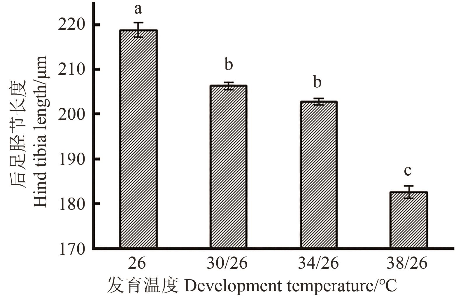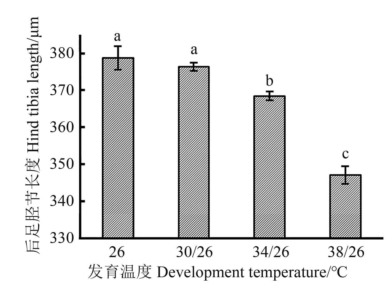 Fig. 1 Hind tibia length of Bemisia tabaci female under different development temperaturesNote: Different lowercase letters indicate significant differences at P<0.05 level.