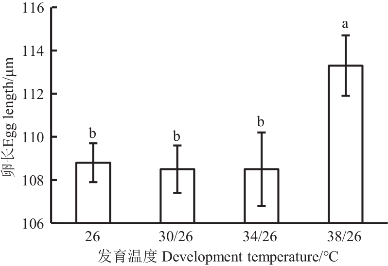 Fig. 4 Egg length of Encarsia formosa females under different development temperaturesNote: Different lowercase letters indicate significant differences at P<0.05 level.