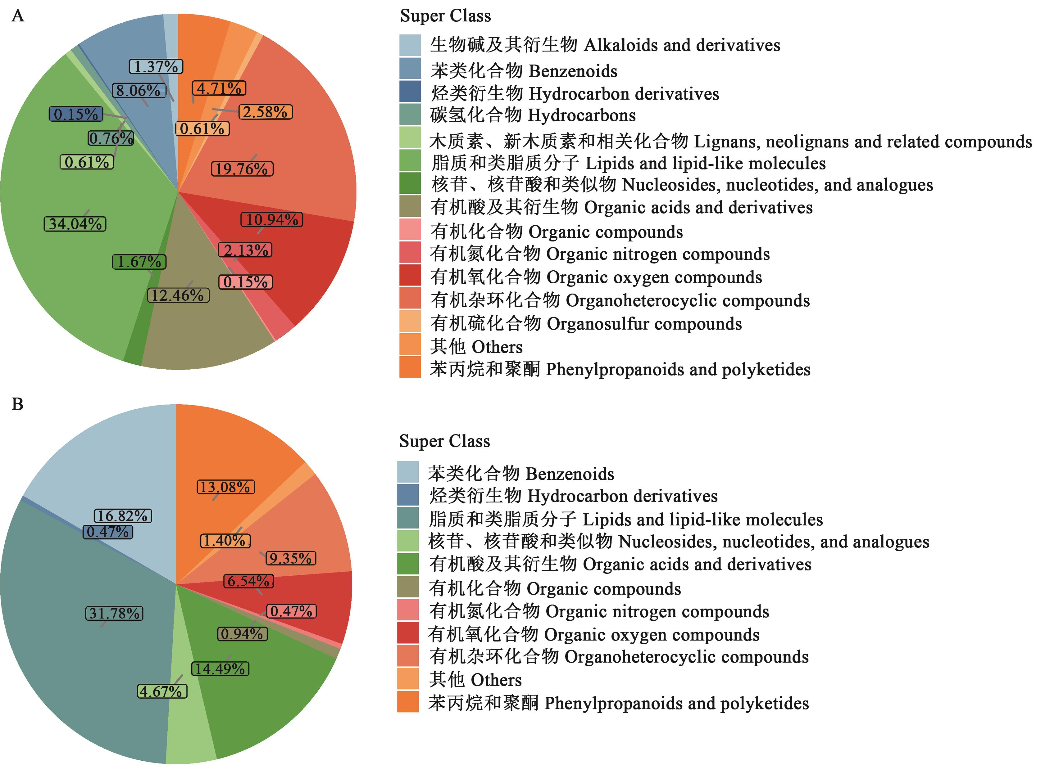 图2 根系分泌物在Super Class层级不同分类中所占比重A:正离子模式;B:负离子模式