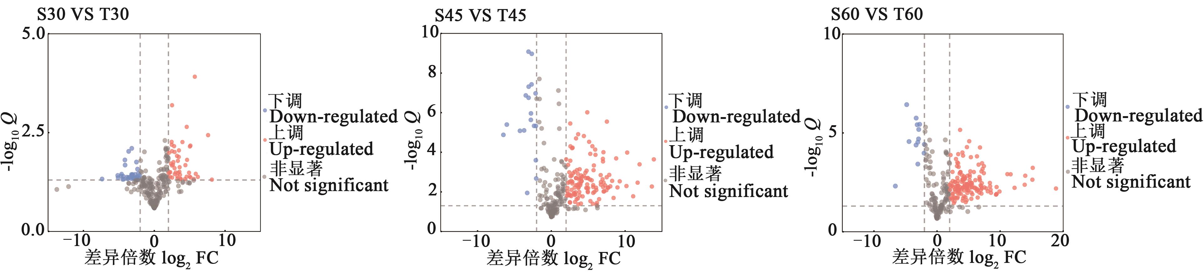 图5 不同生长时期两种培养方式烟草根系分泌物的差异表达火山图注:红色节点代表Q<0.05且log2FC>2的上调代谢物;蓝色节点代表Q<0.05且log2FC<-2的下调代谢物。