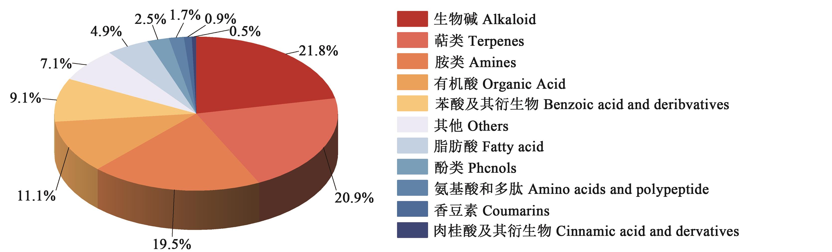 为探索长期连作状态下烟草根系分泌物内含有的化感物质组成成分,设置石英砂栽培和连作土壤栽培2种烟草培养处理,对2种烟草不同生长时期的根系分泌物进行提取,利用超高效液相色谱串联质谱(ultra-high performance liquid chromatography tandem mass spectrometry, UHPLC-MS/MS)对提取的根系分泌物进行分析,通过数据库比对、差异分析和时间聚类分析等方法筛选连作烟草根系分泌物中潜在的化感物质。结果表明,共筛选出11类潜在化感物质,分别为生物碱、萜类、胺类、有机酸、苯酸及其衍生物、脂肪酸、酚类、氨基酸和多肽、香豆素、肉桂酸及其衍生物和其他。生物碱、萜类、胺类和有机酸4类化合物相对含量占所有化合物的73.3%。L-烟碱、熊果酸、β-氨基丙腈、5-羟基吲哚乙酸、早熟素Ⅱ、单乙基己基邻苯二甲酸、己内酰胺、姜酚、L-乳酸、邻苯二甲酸二乙酯和2,3-二氢-3,5-二羟基-2-氧代-3-吲哚乙酸甲酯是连作烟草根系分泌物中相对含量较高的潜在化感物质。研究结果为烟草根系化感物质的化感作用研究及缓解烟草连作障碍方法研究提供理论基础。