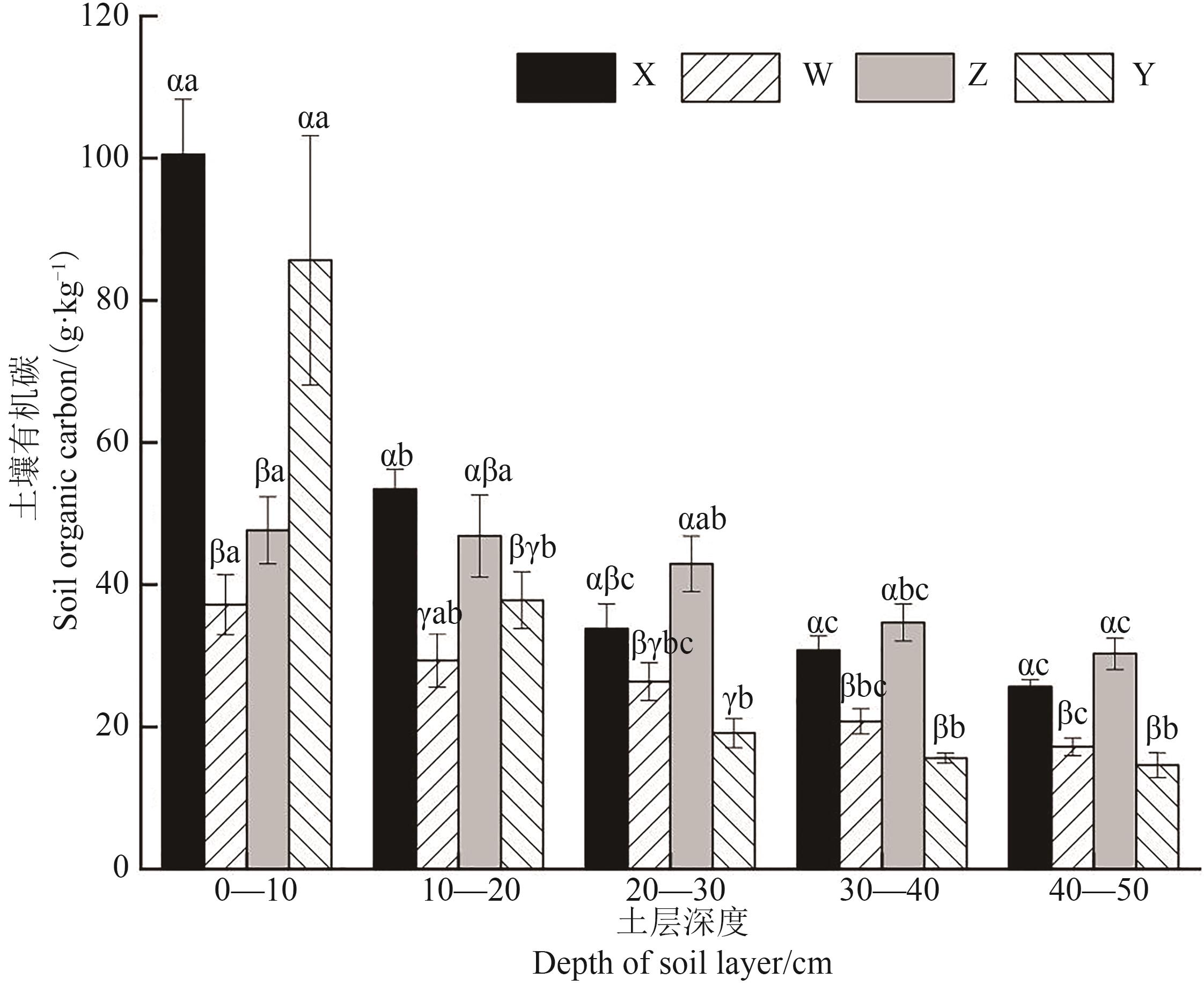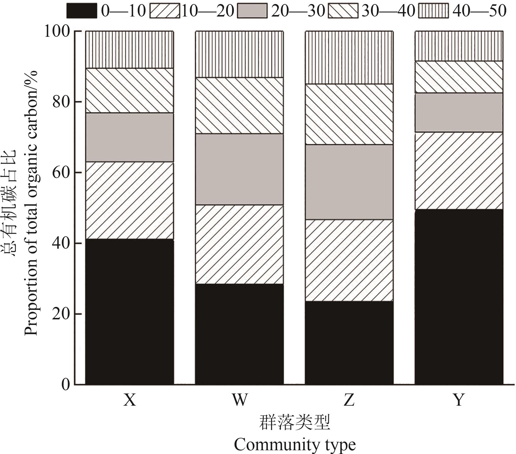 图1 4种植物群落不同深度的土壤有机碳含量注:不同希腊字母表示相同土层不同植物群落间在P<0.05水平差异显著;不同英文字母表示同一植物群落不同土层间在P<0.05水平差异显著。