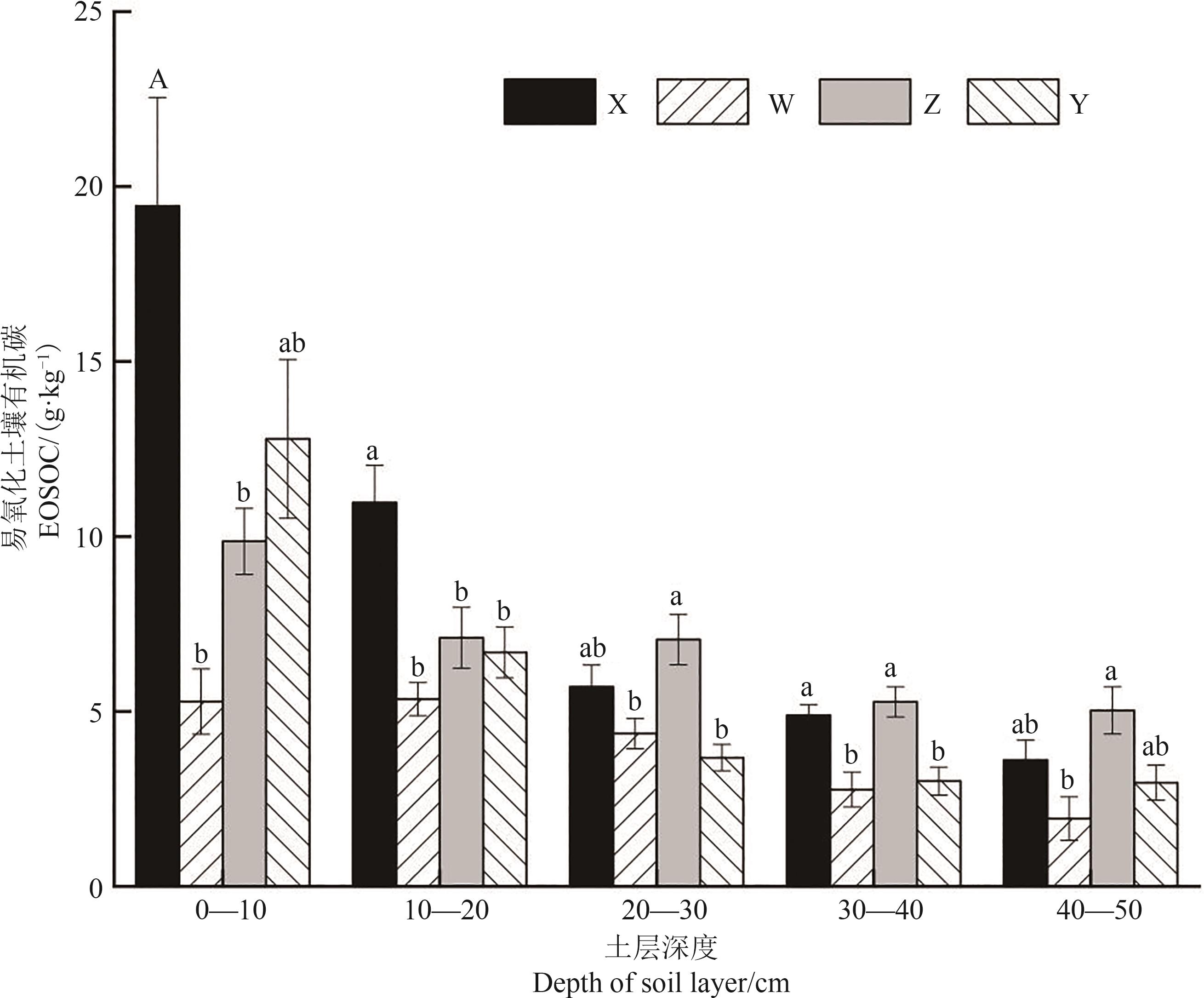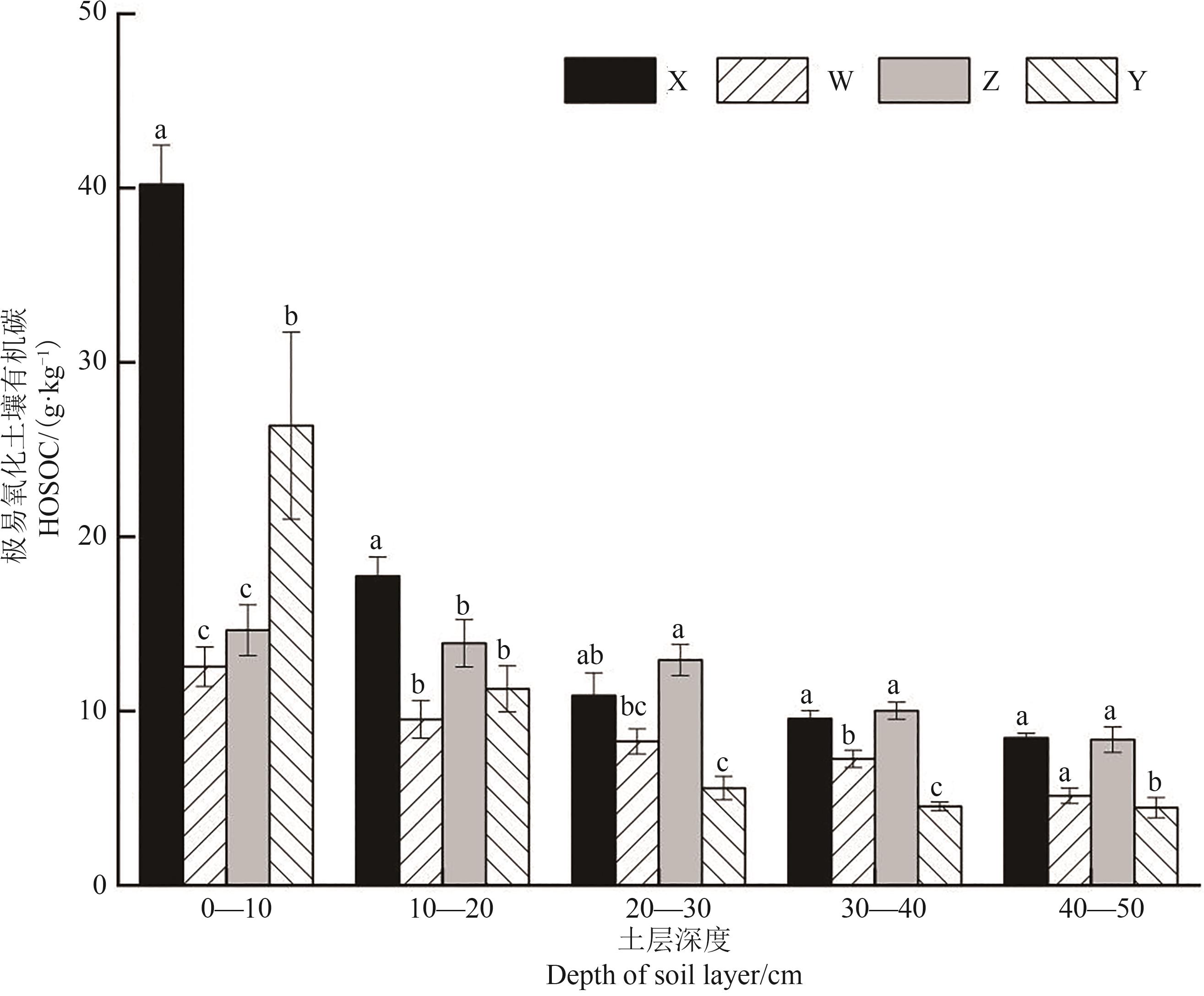 Fig. 3 Soils highly susceptible oxidizing organic carbon of 4 typical plant communitiesNote: Different lowercase letters indicate significant differences between different plant communities of same soil layer at P<0.05 level.