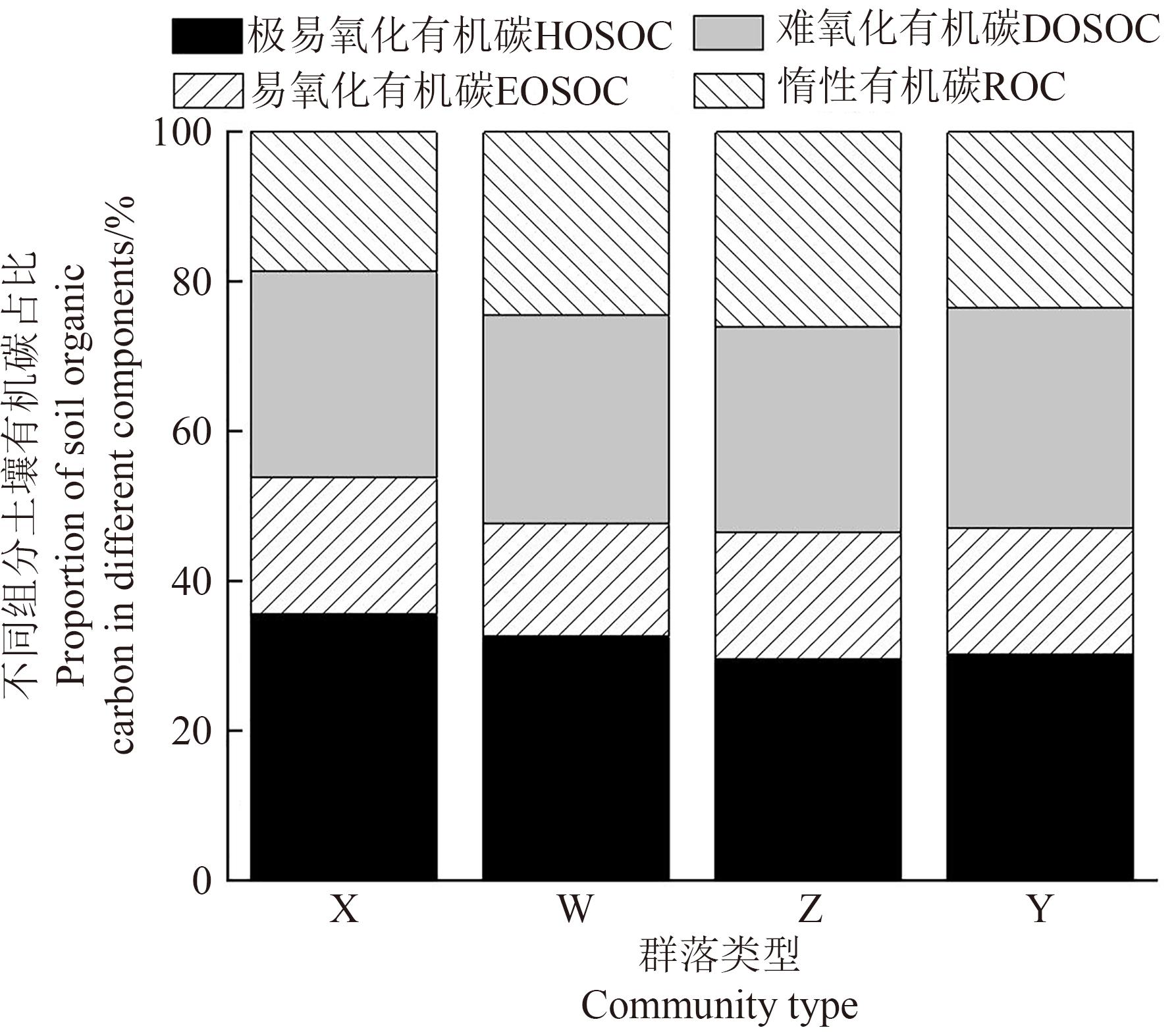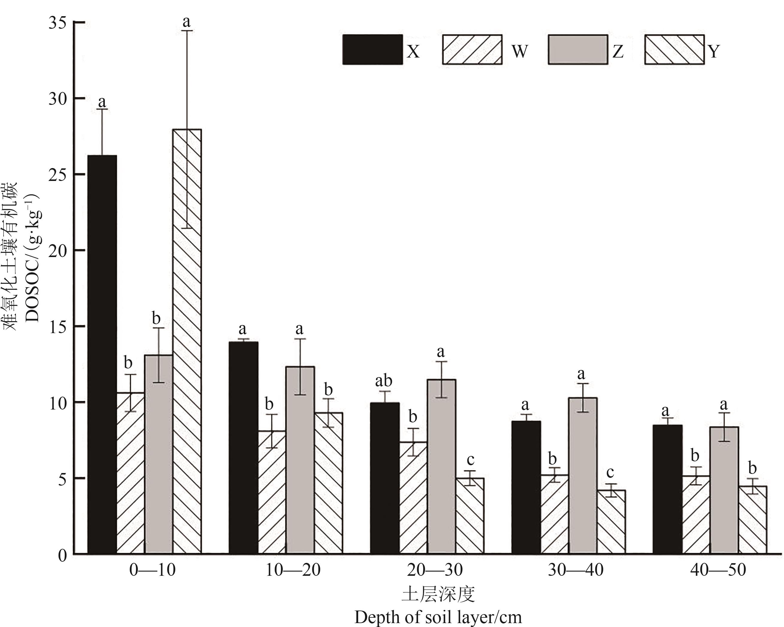 图5 4种典型植物群落土壤难氧化有机碳注:不同小写字母表示相同土层不同植物群落间在P<0.05水平差异显著。