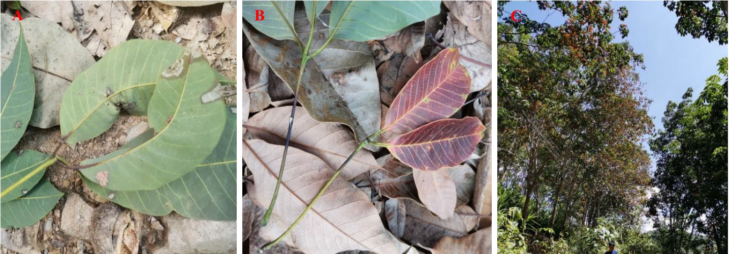 Fig. 1 Symptoms of abnormal leaf fall diseases on rubber tree in fieldA: Infected leaf blades; B: Lesions on the petioles; C: Symptoms of rubber trees