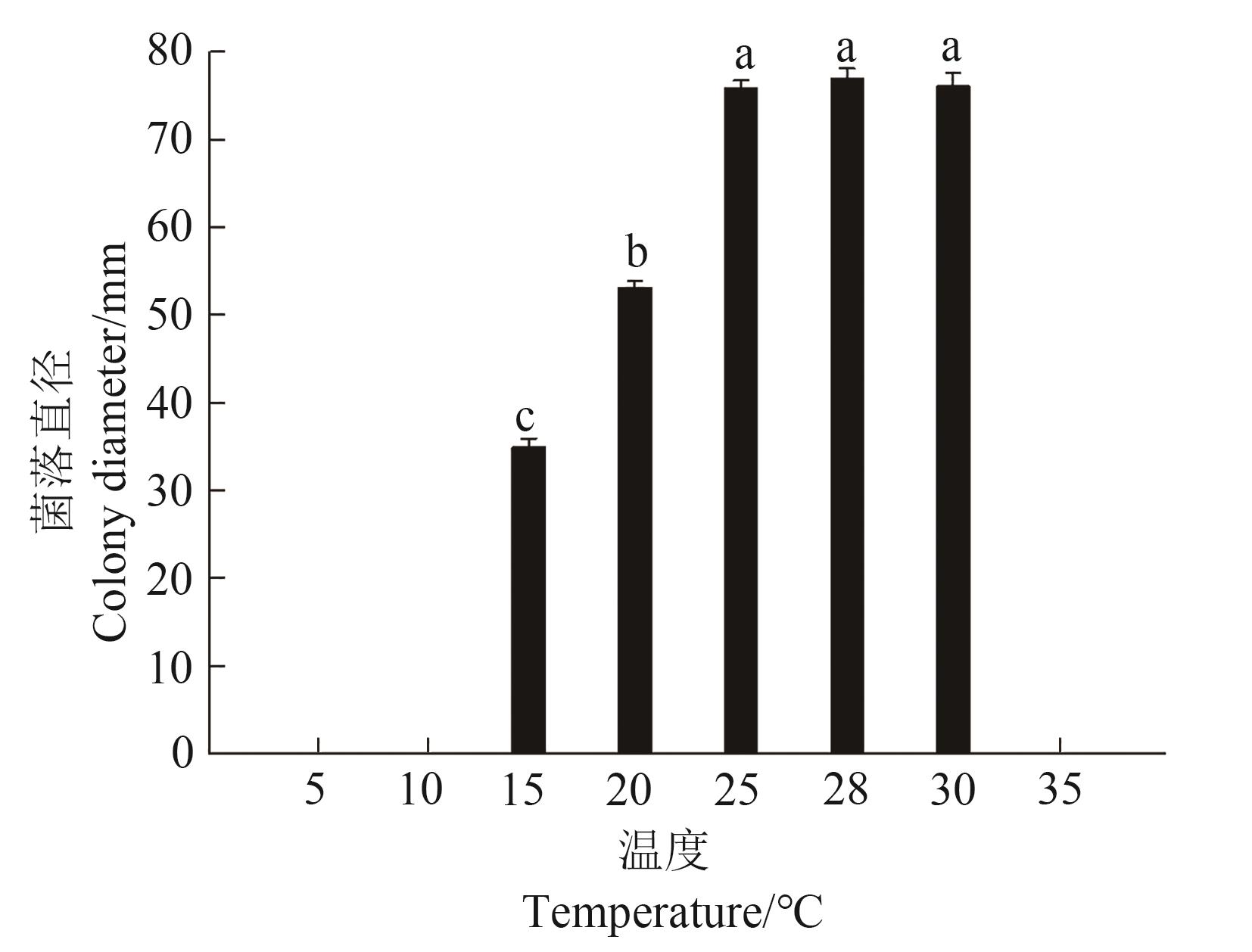 Fig. 3 Mycelial growth of the pathogen at different temperature on CA mediumNote: Different lowercase letters indicate significant differences between different temperatures at P<0.05.