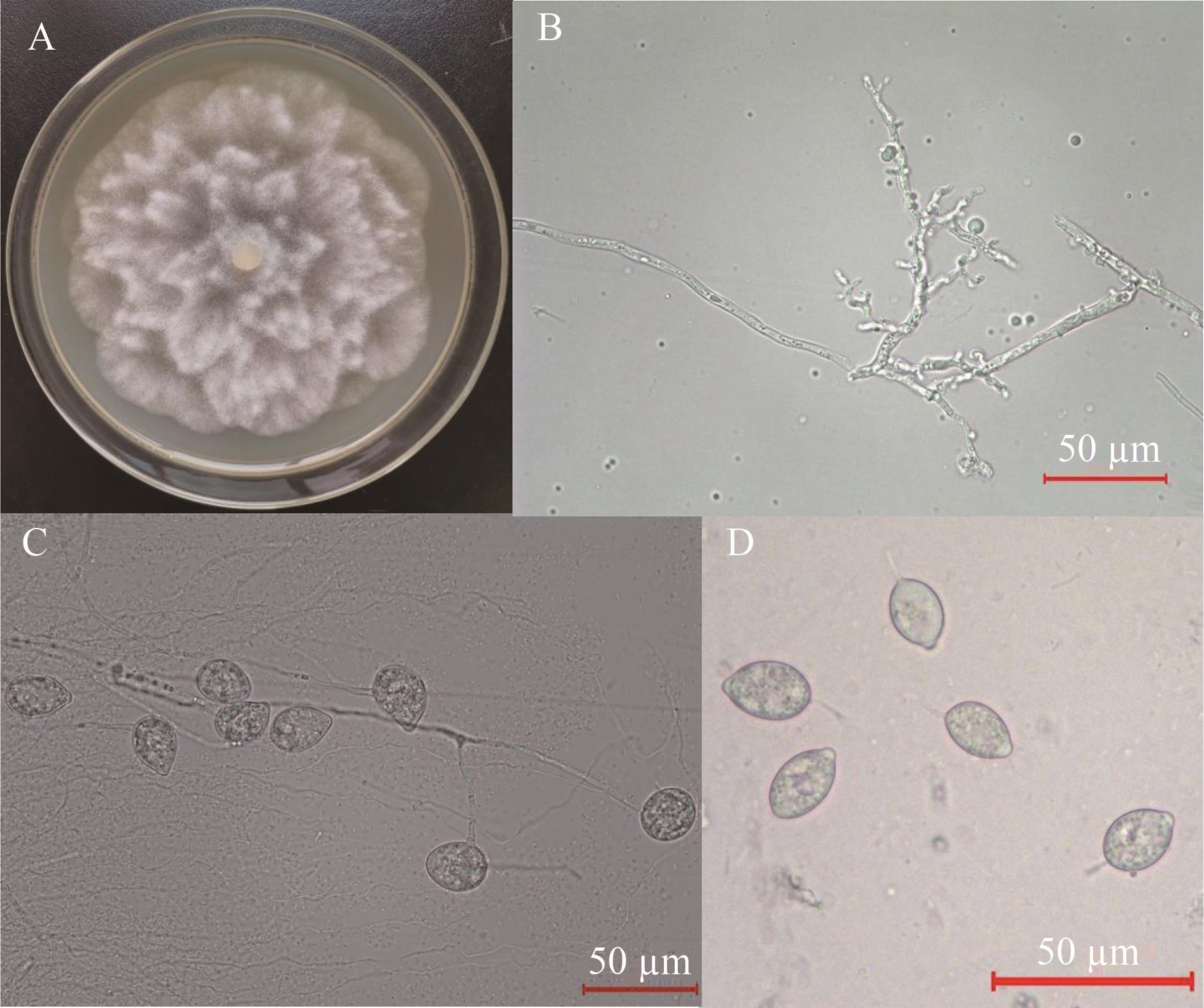 Fig. 4 Culture characteristics and microscopic features of the pathogen on CA culture mediumA: Colony morphology; B: Coralloid long hyphae; C: Sporangia (asexual stage); D: Mature sporangia (asexual stage)