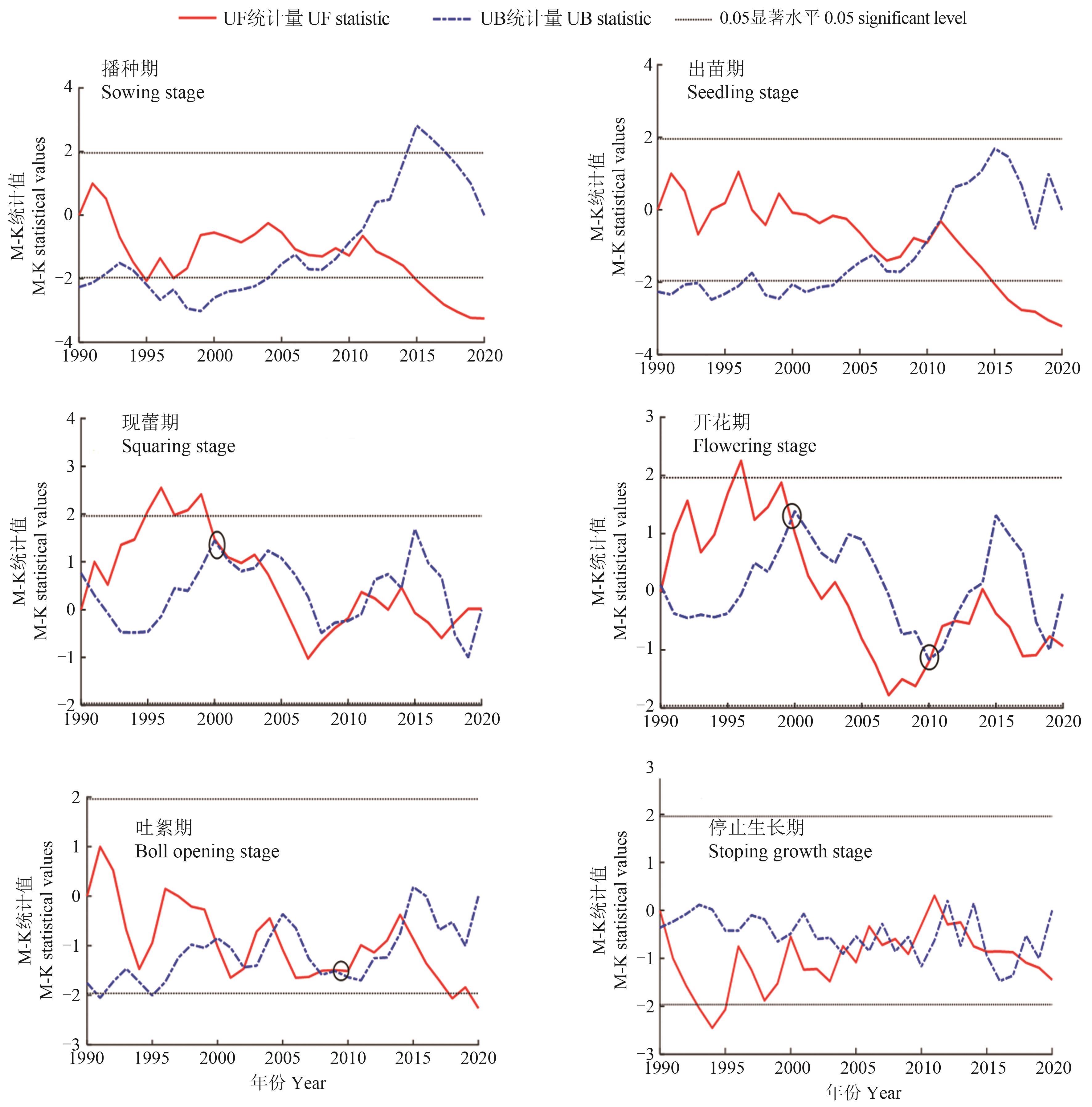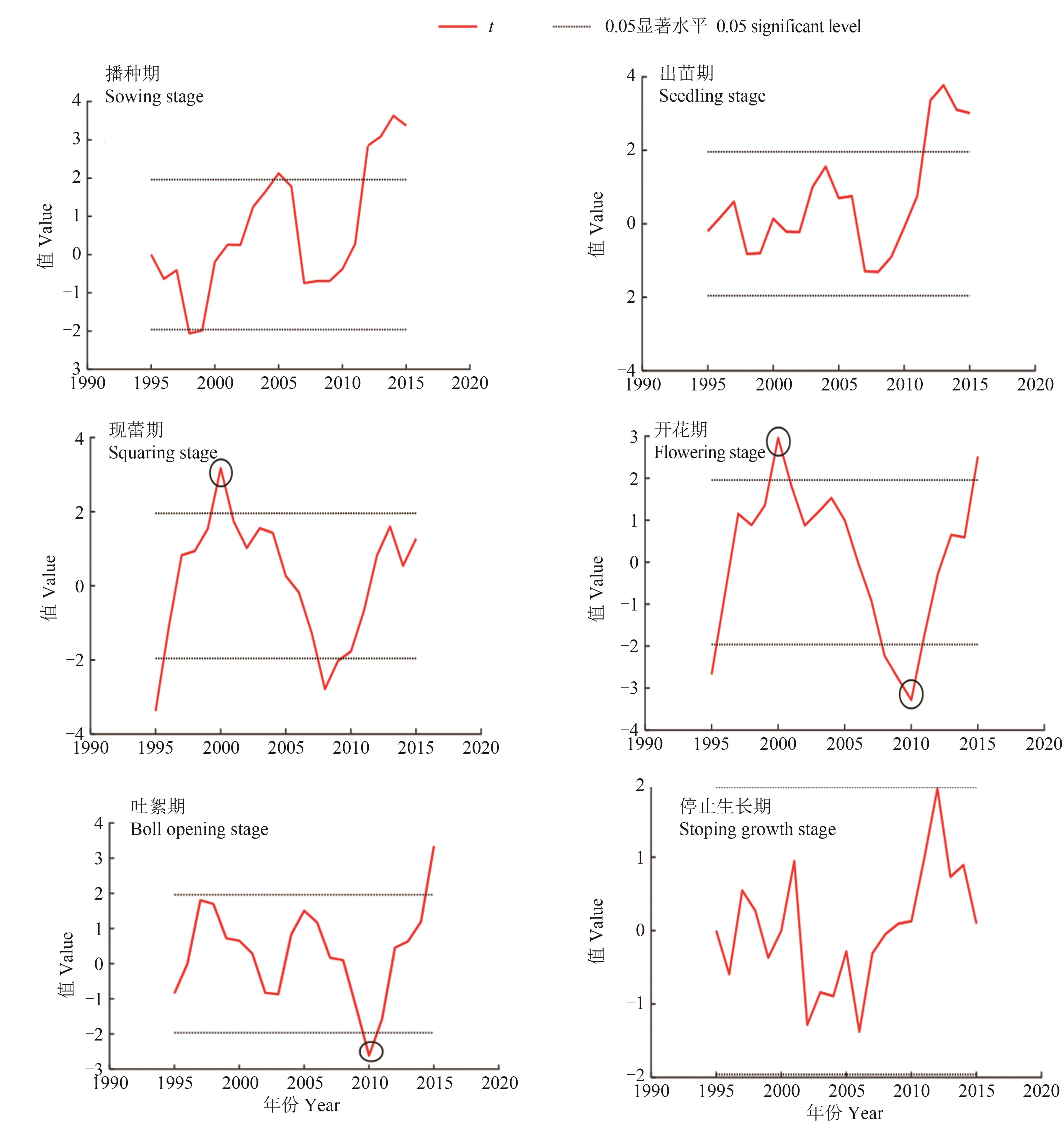物候是气候变化的感应器,能客观反映气候变化对棉花生长周期的影响。为探究气候暖湿化背景下南疆阿拉尔垦区棉花物候期的动态变化,选取1990—2020年南疆阿拉尔垦区棉花物候期数据,运用距平、累积距平、Mann-Kendall非参数检验和滑动t检验等统计学方法,分析南疆阿拉尔垦区棉花物候期动态变化及其突变情况。结果表明,1990—2020年南疆阿拉尔垦区棉花平均播种期、出苗期、现蕾期、开花期、吐絮期和停止生长期分别出现在4月14日、4月29日、6月3日、7月2日、9月17日和10月20日,极差分别为25、23、20、22、44和24 d。1990—2020年垦区棉花播种期和出苗期均呈现极显著提前趋势,表现为“显著提前-稍微提前”的过程变化;开花期和停止生长期均呈现显著提前趋势,表现为“显著提前-稍微提前”的过程变化;吐絮期提前和现蕾期延迟均不显著。1990—2020年垦区棉花现蕾期、开花期和吐絮期阶段性变化特征明显,主要表现在现蕾期的阶段性推迟、吐絮期的阶段性提前、开花期的阶段性推迟与提前上,棉花播种期、出苗期和停止生长期阶段性变化特征不明显。研究结果为更好地评估气候暖湿化背景下垦区棉花生长和科学管理棉田提供理论依据。