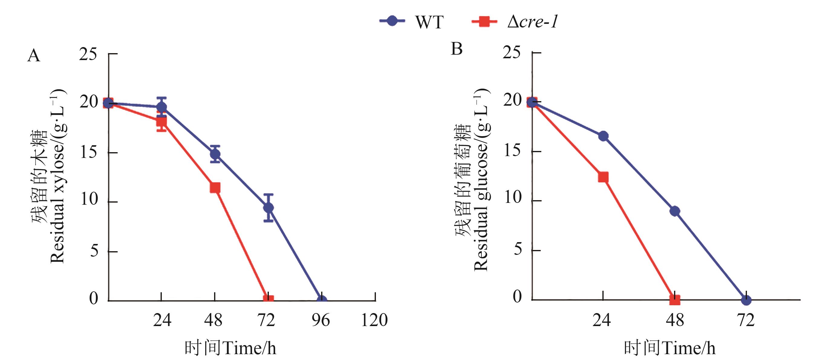图3 嗜热毁丝霉突变体Δcre-1表型分析A:嗜热毁丝霉野生型菌株和突变体Δcre-1的木糖利用;B:嗜热毁丝霉野生型菌株和突变体Δcre-1的葡萄糖利用