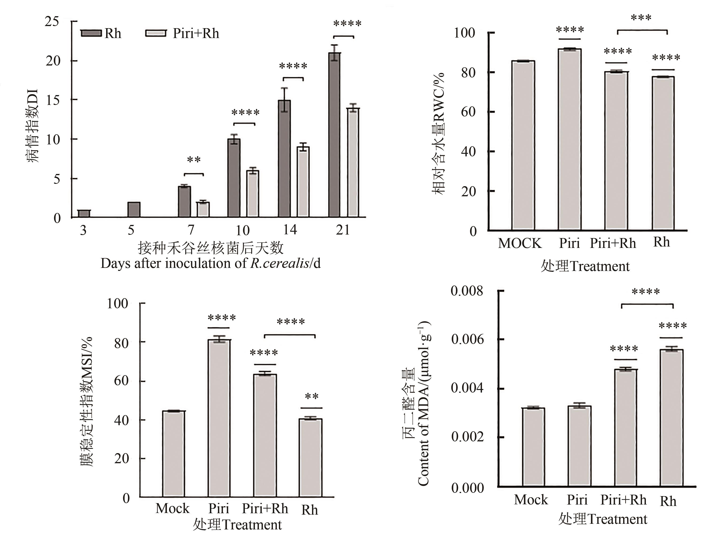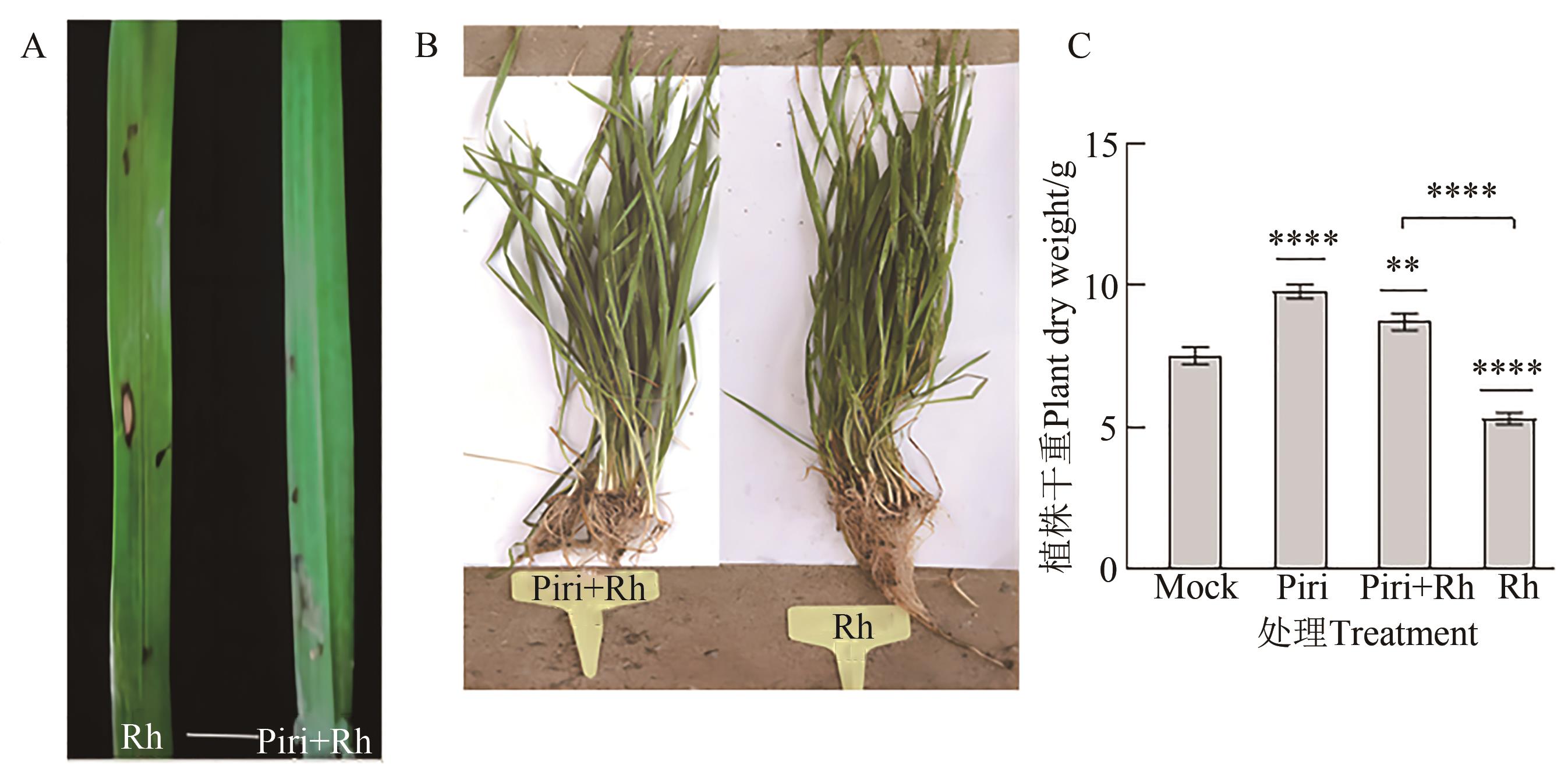 小麦纹枯病是一种世界性频发土传病害,对小麦稳产高产危害严重。为了明确内生真菌印度梨形孢(Piriformospora indica)对小麦抗纹枯病的诱导作用,突破传统依赖于化学药剂的防治模式,利用生物方法提高小麦对纹枯病的抗性,采用印度梨形孢孢子液浸泡小麦种子,然后用禾谷丝核菌(Rhizoctonia cerealis)侵染小麦植株,并对其相关生理生化指标和转录组数据进行分析。结果表明,小麦预先定殖印度梨形孢能增加细胞内抗氧化酶活性,缓解由于病菌引起的细胞内相对水含量降低,使因病菌侵染而破环的的膜稳定性上升39.6%,并能提高32.3%的叶绿素含量,增强小麦光合作用。转录组分析结果显示,印度梨形孢的定殖能改变病原菌引起的转录组变化并诱导相关抗性基因表达,通过影响激素代谢途径,提高植物生物量,利用多种路径和手段综合提高小麦对禾谷丝核菌的抗性。基于转录组数据筛选出了TraesCS1A02G372300TraesCS1B02G393100等关键基因,为深入理解植物与微生物互作、加速相关抗病增产育种工作等提供理论基础与试验依据。