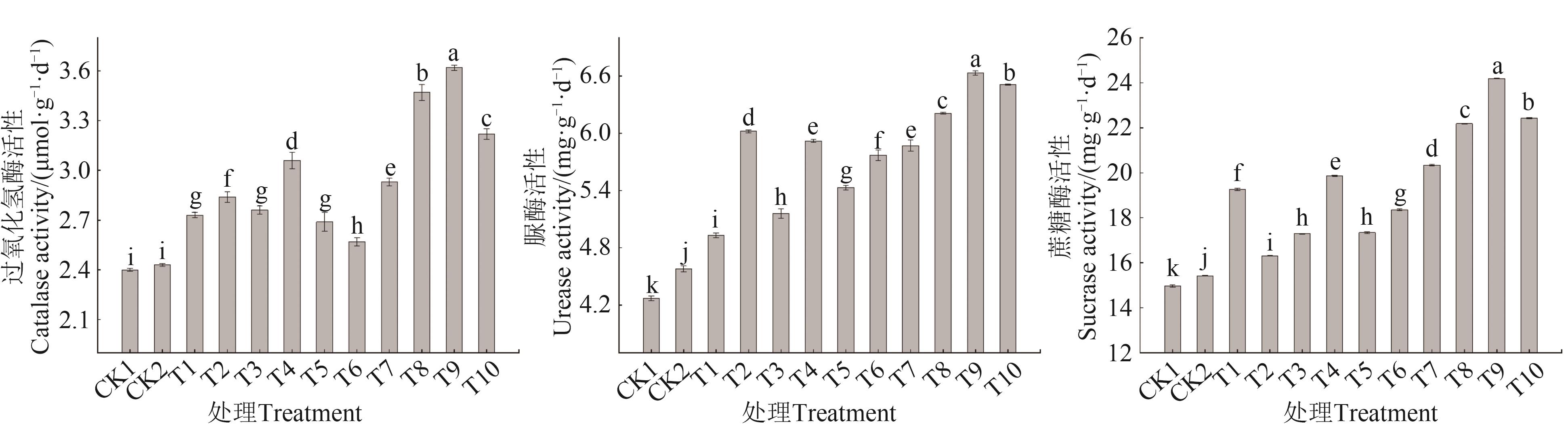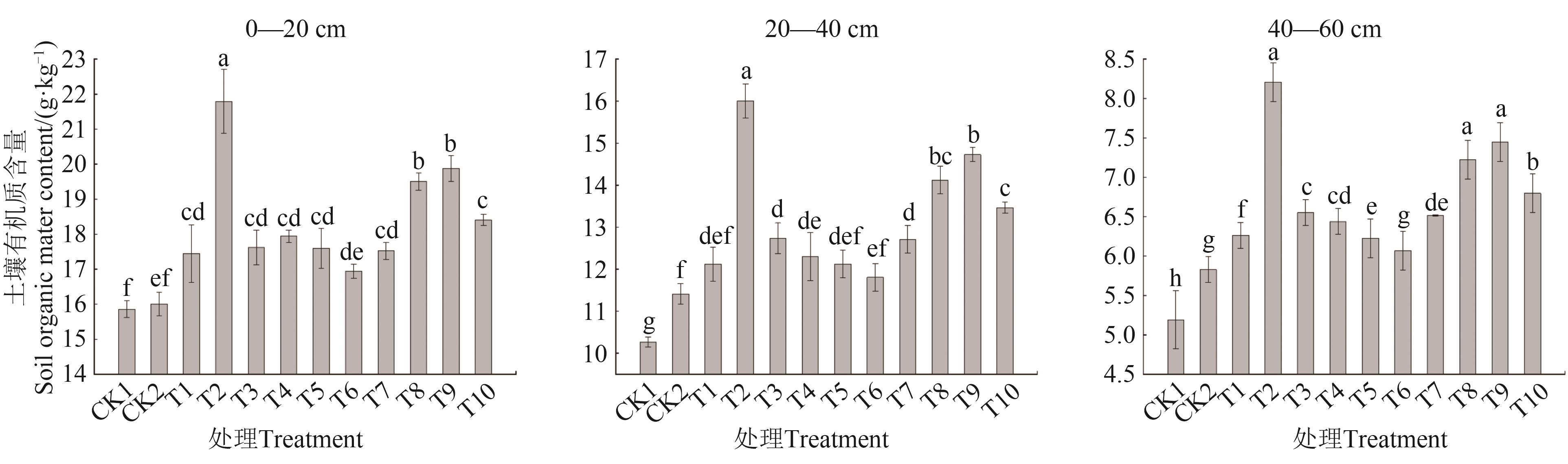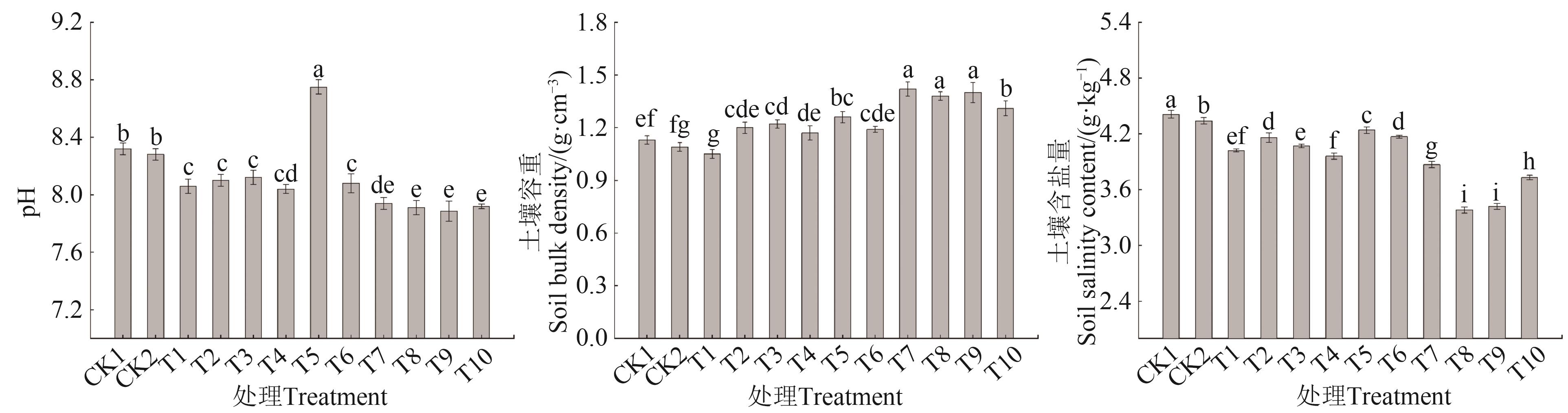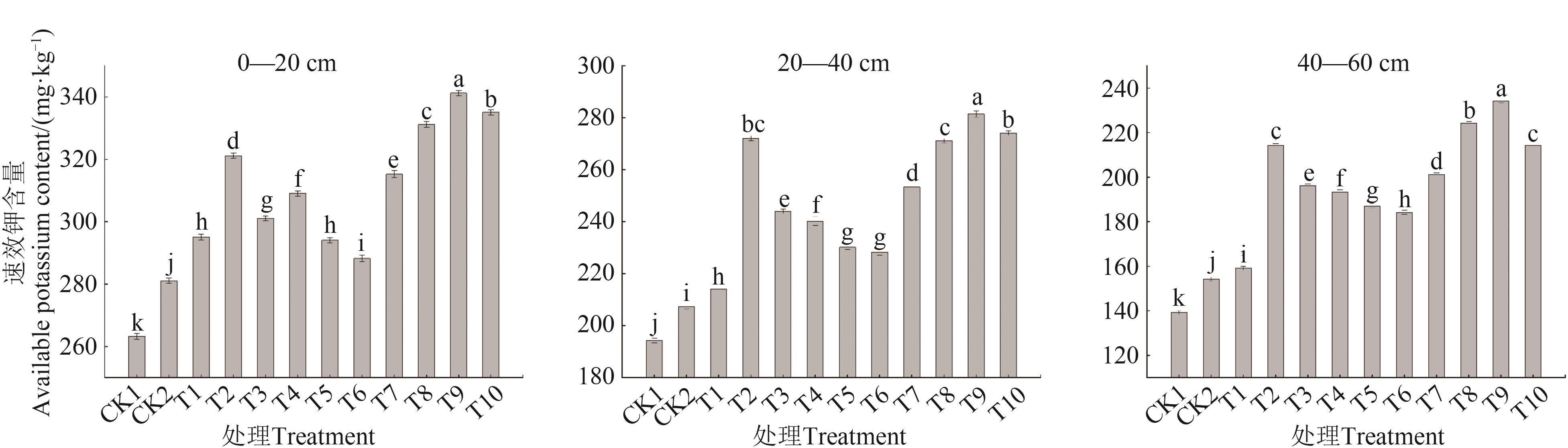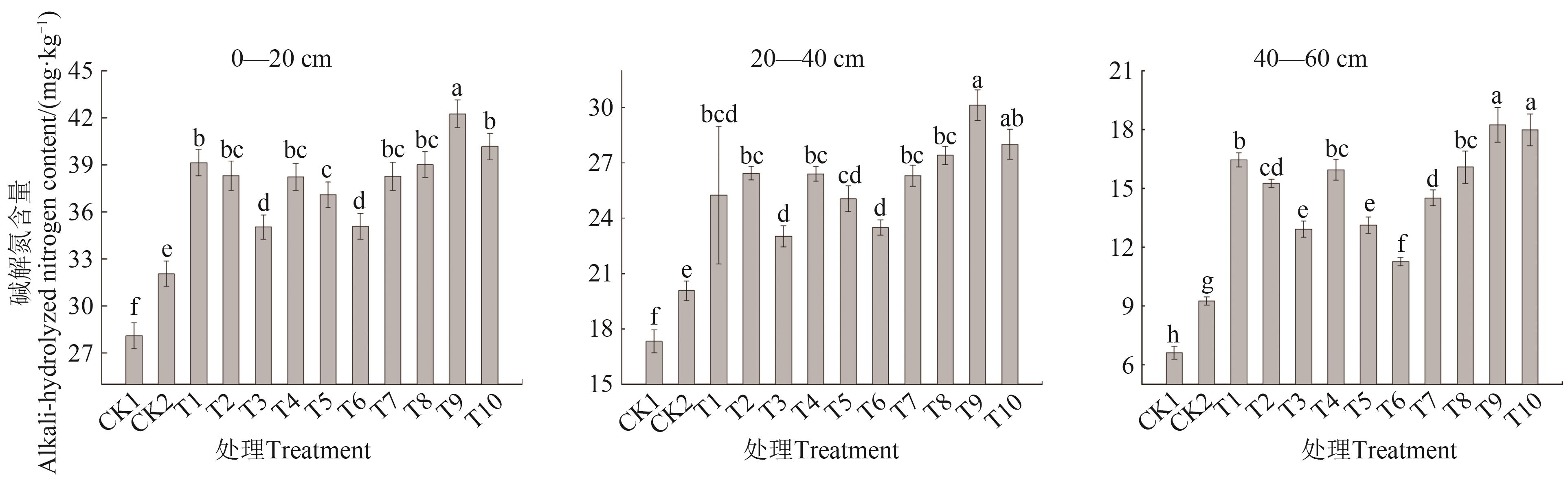 为研究不同肥料配施对土壤营养及樱桃幼树树体长势的影响,以2年生‘美早’樱桃为试材,以不施肥(CK1)和常规施肥(CK2)作为对照,然后在常规施肥的基础上,分别配施氨基酸水溶肥(T1)、有机肥(T2)、微量元素水溶肥料(T3)、微生物菌肥(T4)、赤·吲乙·芸苔(T5)、芸苔素内酯(T6)、盐碱土壤改良剂(T7)、盐碱土壤改良剂+微生物菌肥(T8)、盐碱土壤改良剂+微生物菌肥+氨基酸水溶肥(T9)、盐碱土壤改良剂+微生物菌肥+赤·吲乙·芸苔(T10),共计12个处理,测定不同处理下土壤的理化性质、养分、酶活性及樱桃幼树生长指标。结果表明,T5处理土壤pH显著高于其他处理;T7、T8、T9处理土壤容重显著高于其他处理;T8、T9处理土壤含盐量较CK1显著降低23.36%、22.45%。T2处理在0—20、20—40 cm土层土壤的有机质含量最高,分别为21.79、16.00 g·kg-1,T2、T8、T9在40—60 cm土层土壤的有机质含量差异不显著。施肥处理土壤的碱解氮、有效磷、速效钾较CK1均有显著提升。T3处理由于施用微量元素水溶肥,土壤微量元素含量有较大提升,其他处理较CK1和CK2均有一定提升。T9处理土壤酶活性最高,其过氧化氢酶、脲酶、蔗糖酶活性分别比CK1处理提高50.83%、55.27%、61.70%,且T9处理樱桃的株高、新梢长、新梢粗提升最显著。综上所述,T9处理对增强樱桃树生长量方面有显著作用,能有效降低土壤pH和盐含量,提高土壤养分和理化性质、酶活性。