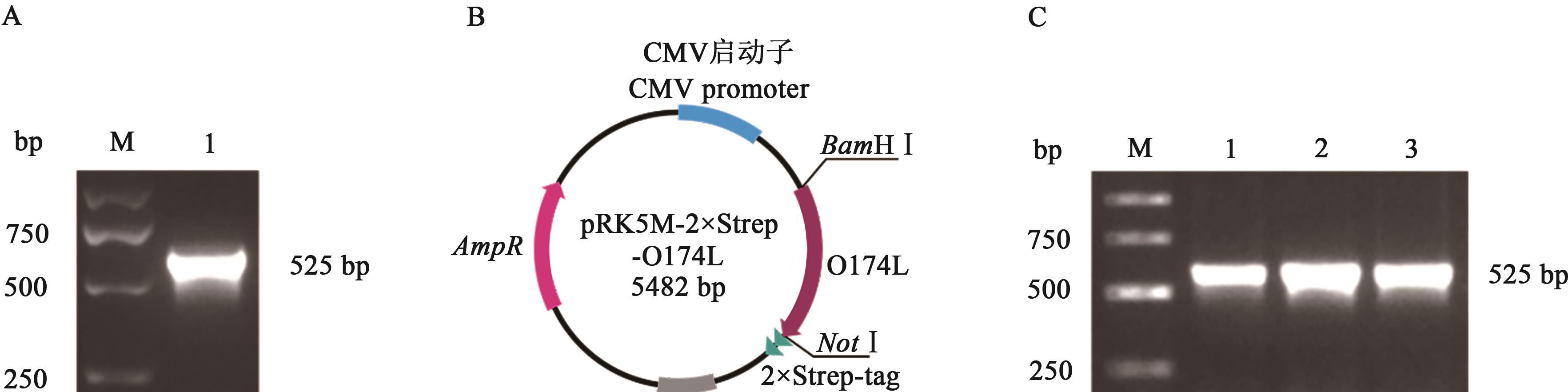 Fig. 5 Construction of O174L gene recombinant plasmidA: PCR of O174L gene; B: Recombinant plasmid pRK5M-C-2×Strep-O174L; C: PCR of target gene in bacteria. M—DNA marker Gs DL2502; 1~3—Amplification product of PCR