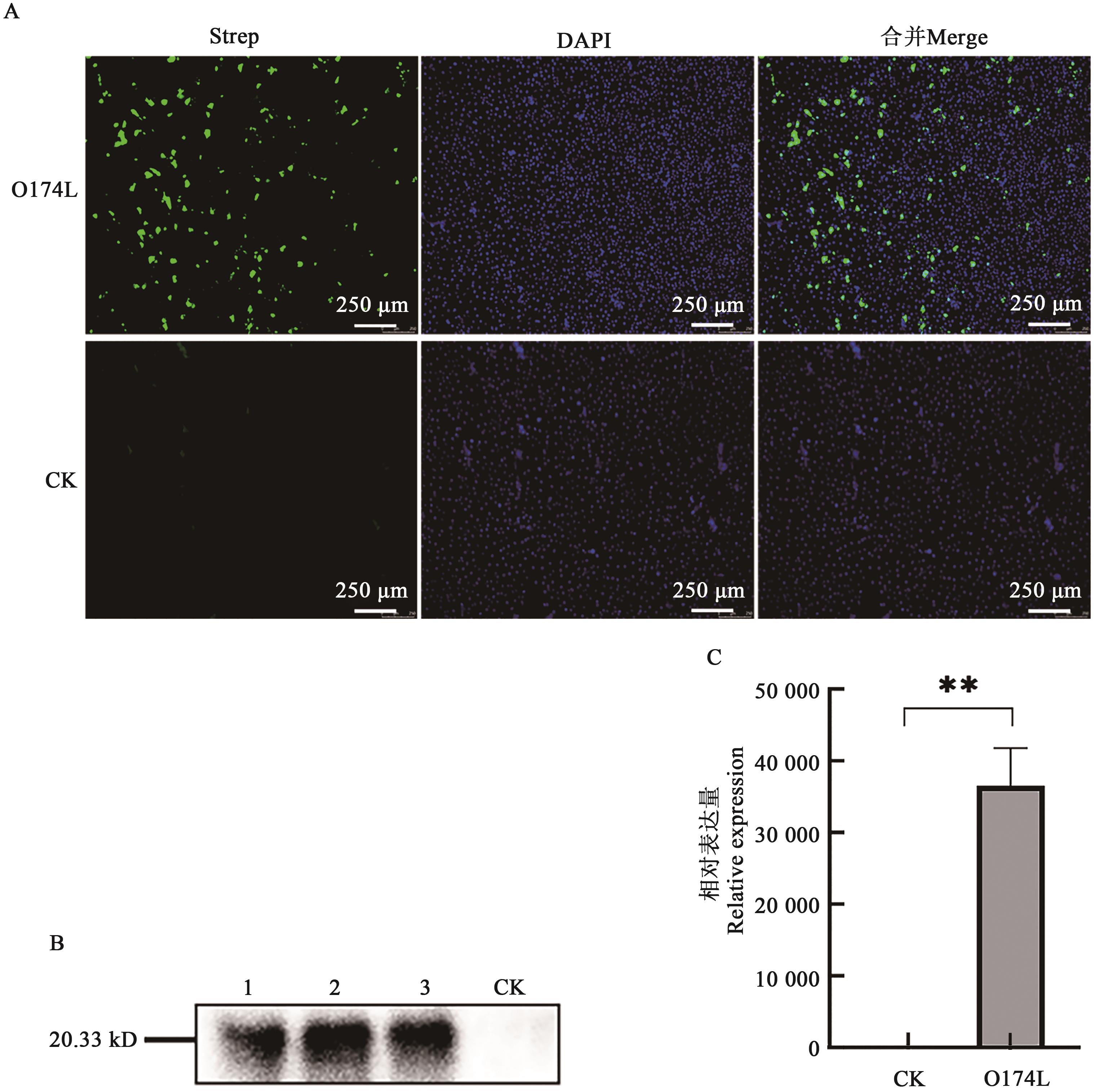 Fig. 6 Detection of intracellular expression of O174LA: Immunofluorescence assay; B: Detection of western blot; C: Expression analysis. DAPI—4’,6-diamidino-2-phenylindole; Strep—Strep-tagged antibodies; CK—Control; 1~3—Biological duplication of O174L protein; ** indicates significant difference at P<0.01 level