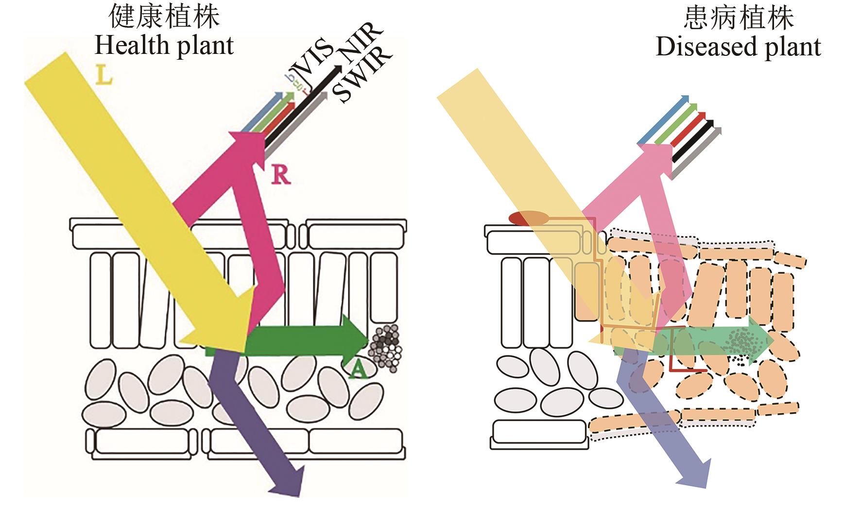 Fig. 1 Reflectance spectra of healthy plants and diseased plantsNote: L—Light; R—Reflect; A—Absorb; VIS—Visible light; NIR—Near-infrared; SWIR—Short wave infrared.