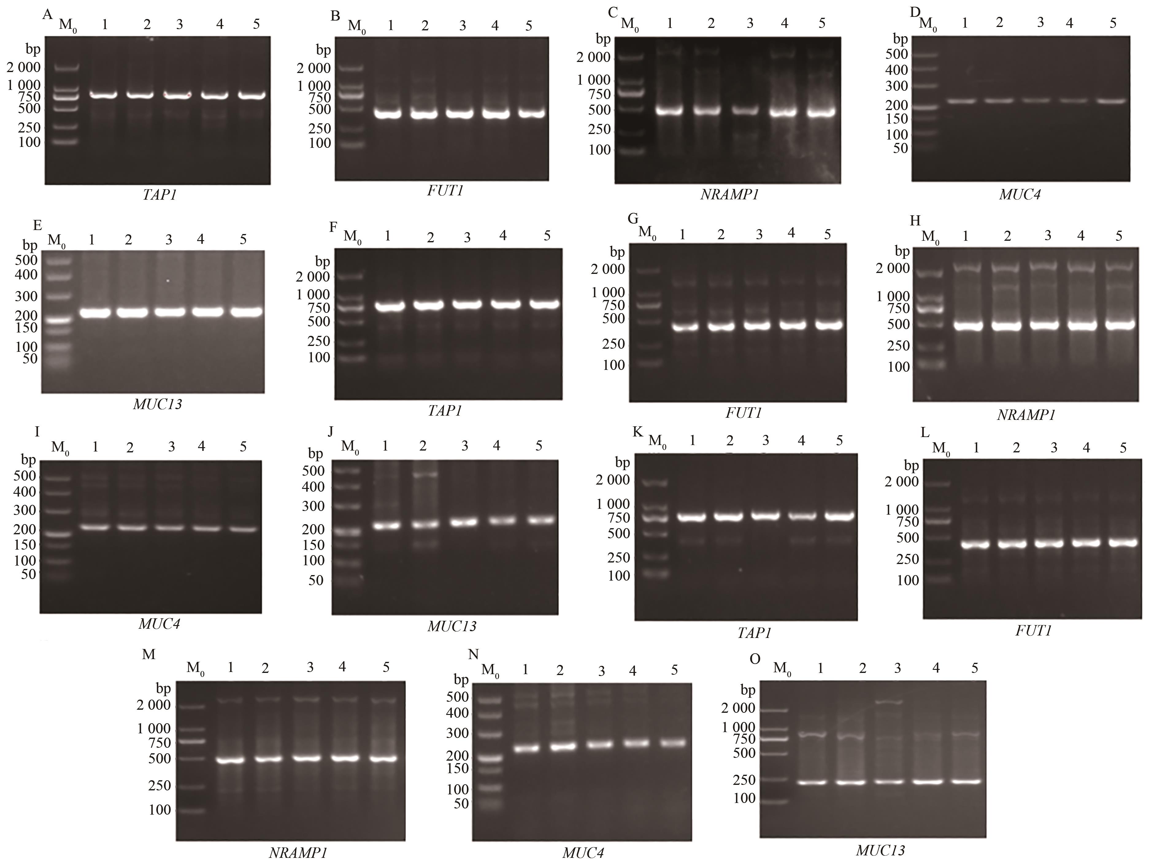 Fig. 1 Electrophoresis of TAP1, FUT1, NRAMP1, MUC4 and MUC13 PCR products from Shanghai White pig, Fengjing pig and Shawutou pigA~E:Electrophoretic map of 5 genes in Shanghai White pig; F~J: Electrophoretic map of 5 genes in Fengjing pig; K~O : Electrophoretic map of 5 genes in Shawutou pig. M0—DNA marker; 1~5 —PCR amplification results