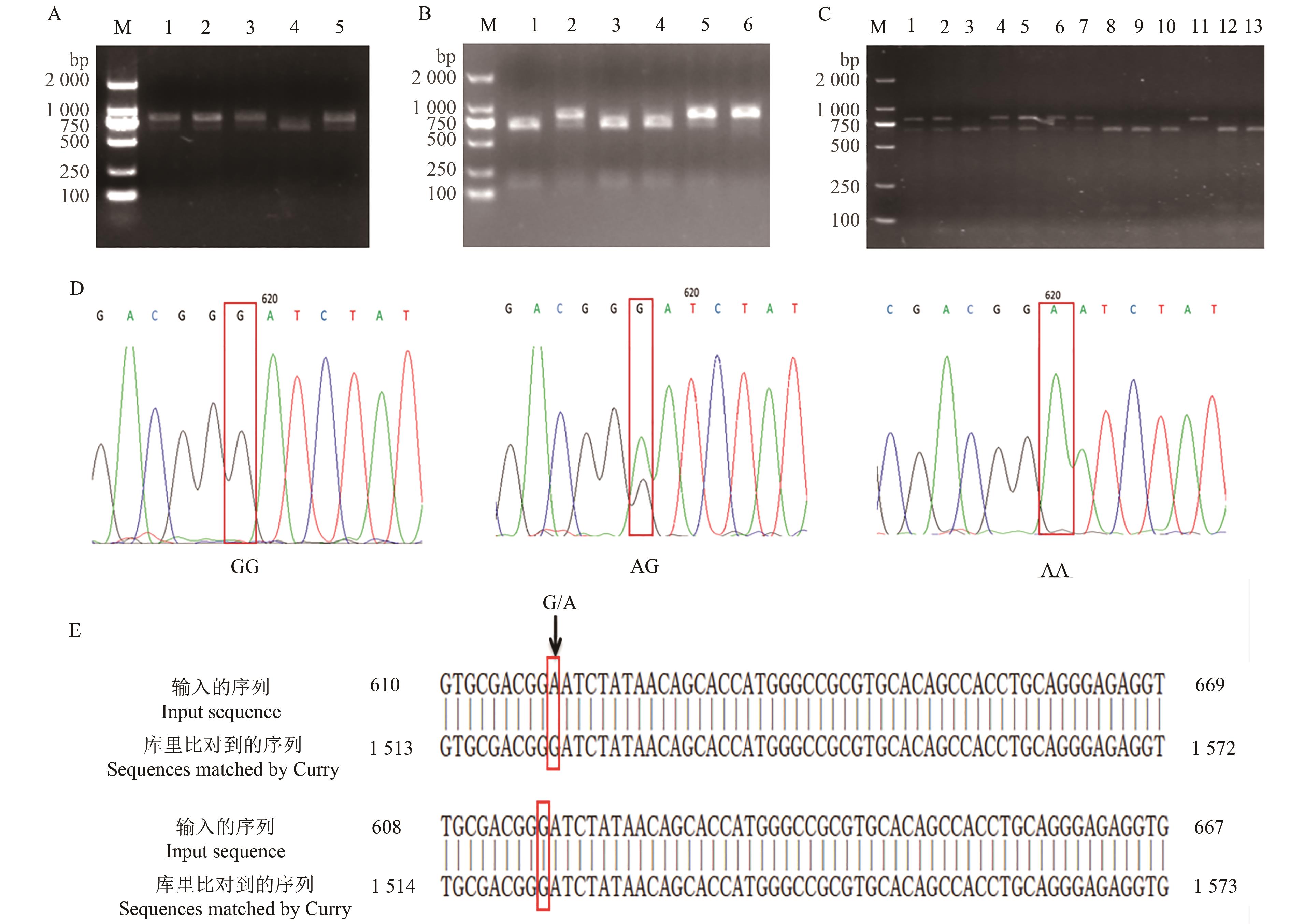 Fig. 2 Enzymatic digestion and sequencing results of TAP1 geneA: Shanghai White pig;M—DL 2000; 1, 2, 3, 5—AG type;4—GG type. B: Fengjing pig;M—DL 2000; 1, 3, 4—GG type; 2, 5—AG type; 6—AA type. C: Shawutou pig; M—DL 2000; 1, 2, 4, 5,6, 7—AG type; 3, 8, 9, 10, 12, 13—GG type; 11—AA type. D: Sequencing peak plot;AA—767 bp; GG—628/139 bp; AG—767/628/139 bp. E: Comparison of NCBI sequence