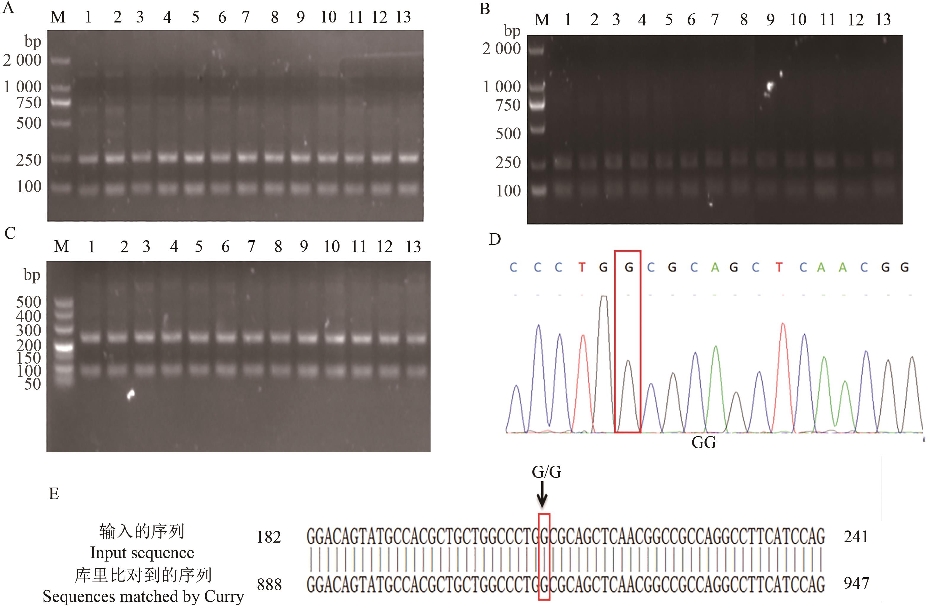图3 FUT1基因酶切和测序结果A:上海白猪;M—DL 2000;1~13—GG。B:枫泾猪;M—DL 2000;1~13—GG。C:沙乌头猪;M—DL 500;1~13—GG。D:测序峰图;GG—241/93/87 bp。E:NCBI序列对比