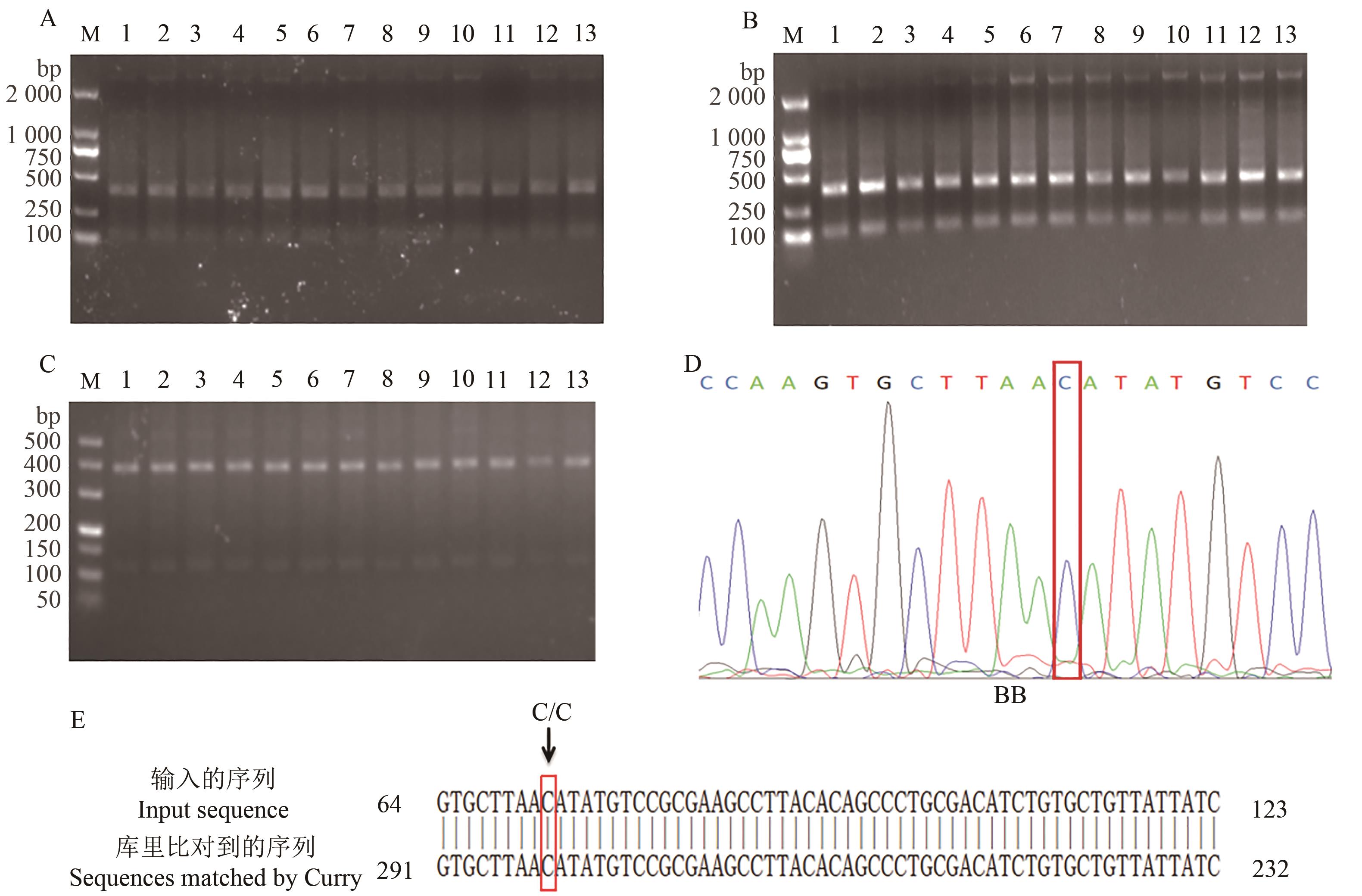 图4 NRAMP1基因酶切与测序结果A:上海白猪;M—DL 2000;1~13—BB型。B:枫泾猪;M—DL 2000;1~13—BB型。C:沙乌头猪;M—DL 500;1~13—BB型。D:测序峰图;AA—483 bp; BB—373/110 bp; AB—483/373/110 bp。E:NCBI序列对比