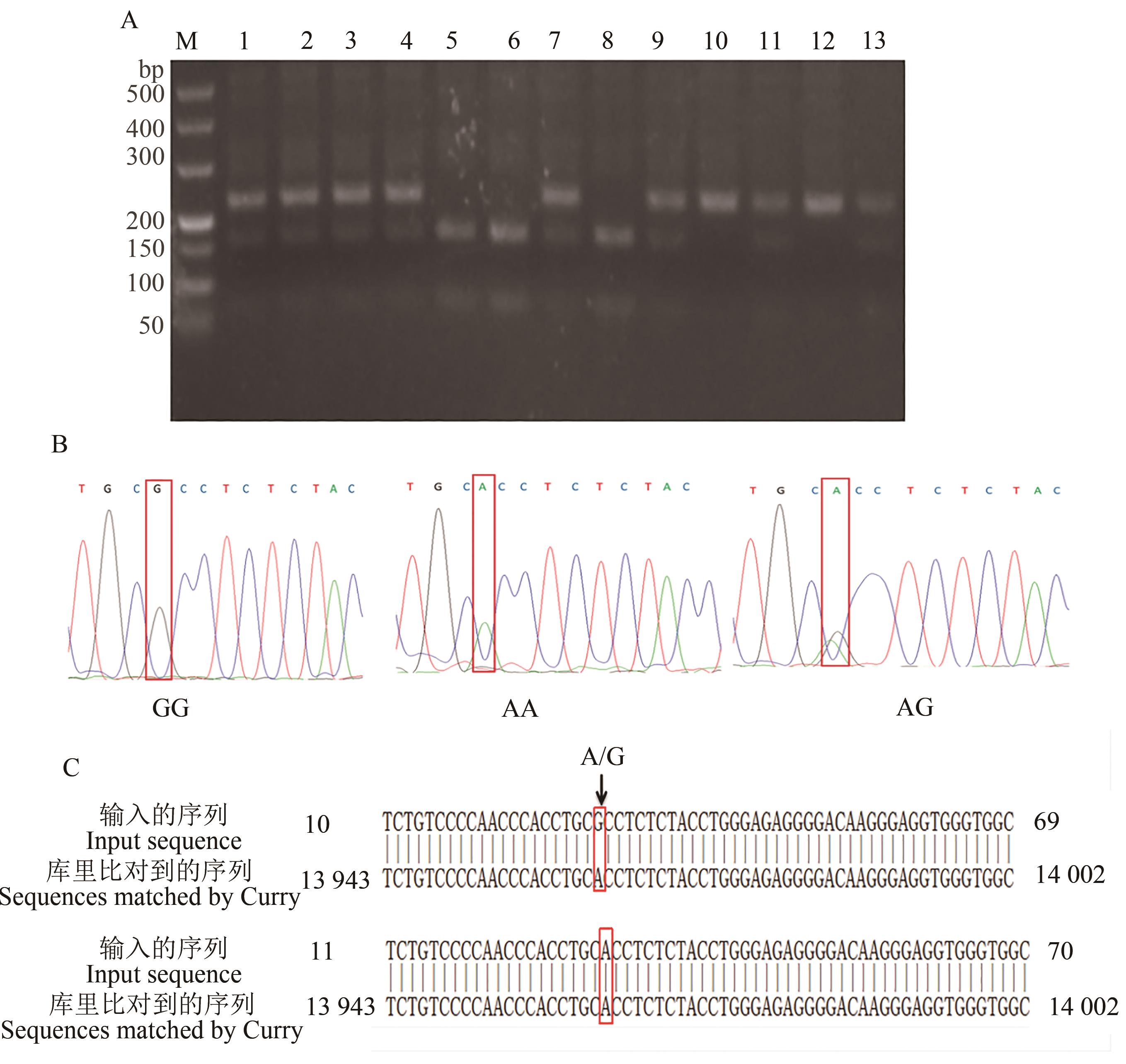 Fig. 5 Enzymatic digestion and sequencing results of MUC4 geneA: Enzymatic digestion results Shawutou pig; M—DL 500; 1, 2, 3, 4, 7, 9, 11, 13 —AG type; 5, 6, 8 — GG type; 10, 12 —AA type. B: Sequencing peak plot;AA—367 bp; GG—151/216 bp; AG—151/216/367 bp. C: Comparison of NCBI sequence