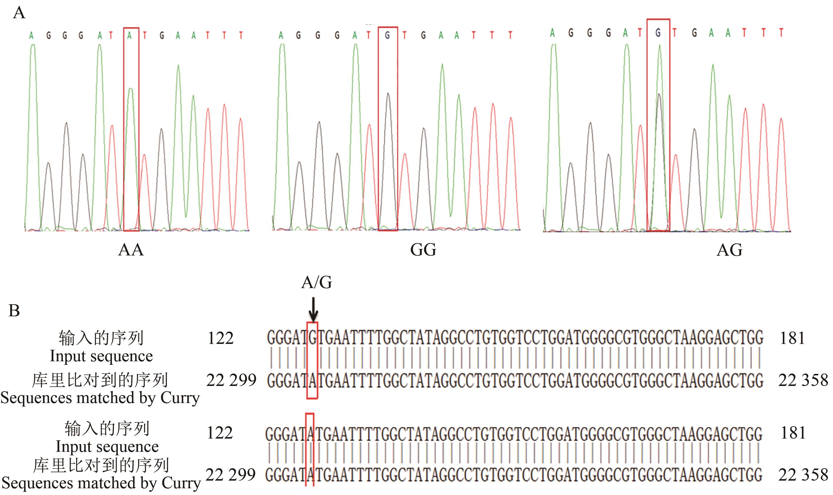 图2 TAP1基因酶切和测序结果A:上海白猪;M—DL 2000;1、2、3、5—AG型;4—GG型。B:枫泾猪;M—DL 2000;1、3、4—GG型;2、5—AG型;6—AA型。C:沙乌头猪;M—DL 2000;1、2、4、5、6、7—AG型;3、8、9、10、12、13—GG型;11—AA型。D:测序峰图;AA—767 bp; GG—628/139 bp; AG— 767/628/139 bp。E:NCBI序列对比