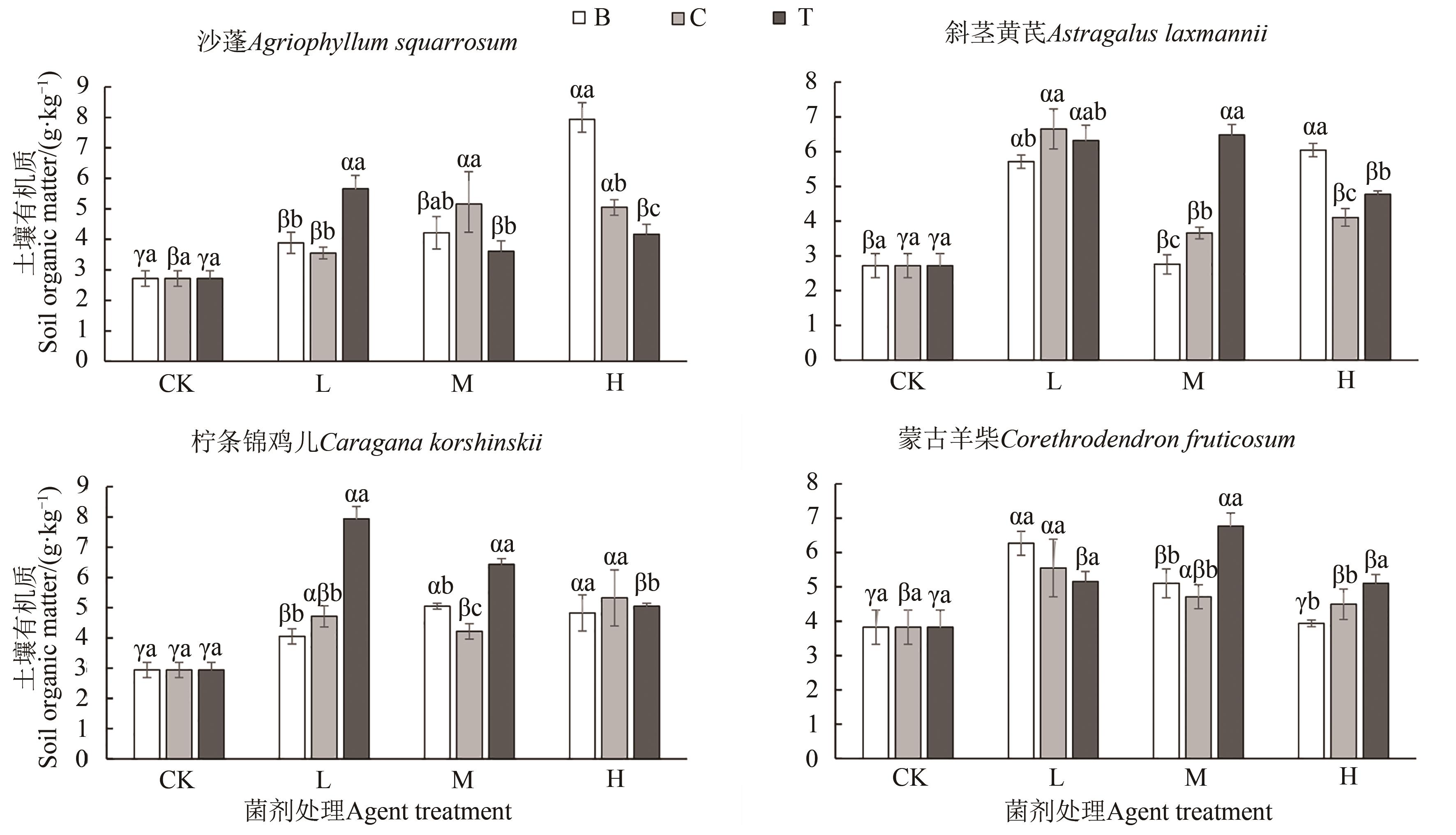 Fig. 2 Soil organic matter content under different microbial agent levels and consolidation layer positionsNote: Different English letters indicate significant differences between different consolidation layer positions of same agent level at P<0.05 level; different Greece letters indicate significant differences between different agent levels of same consolidation layer position at P<0.05 level.