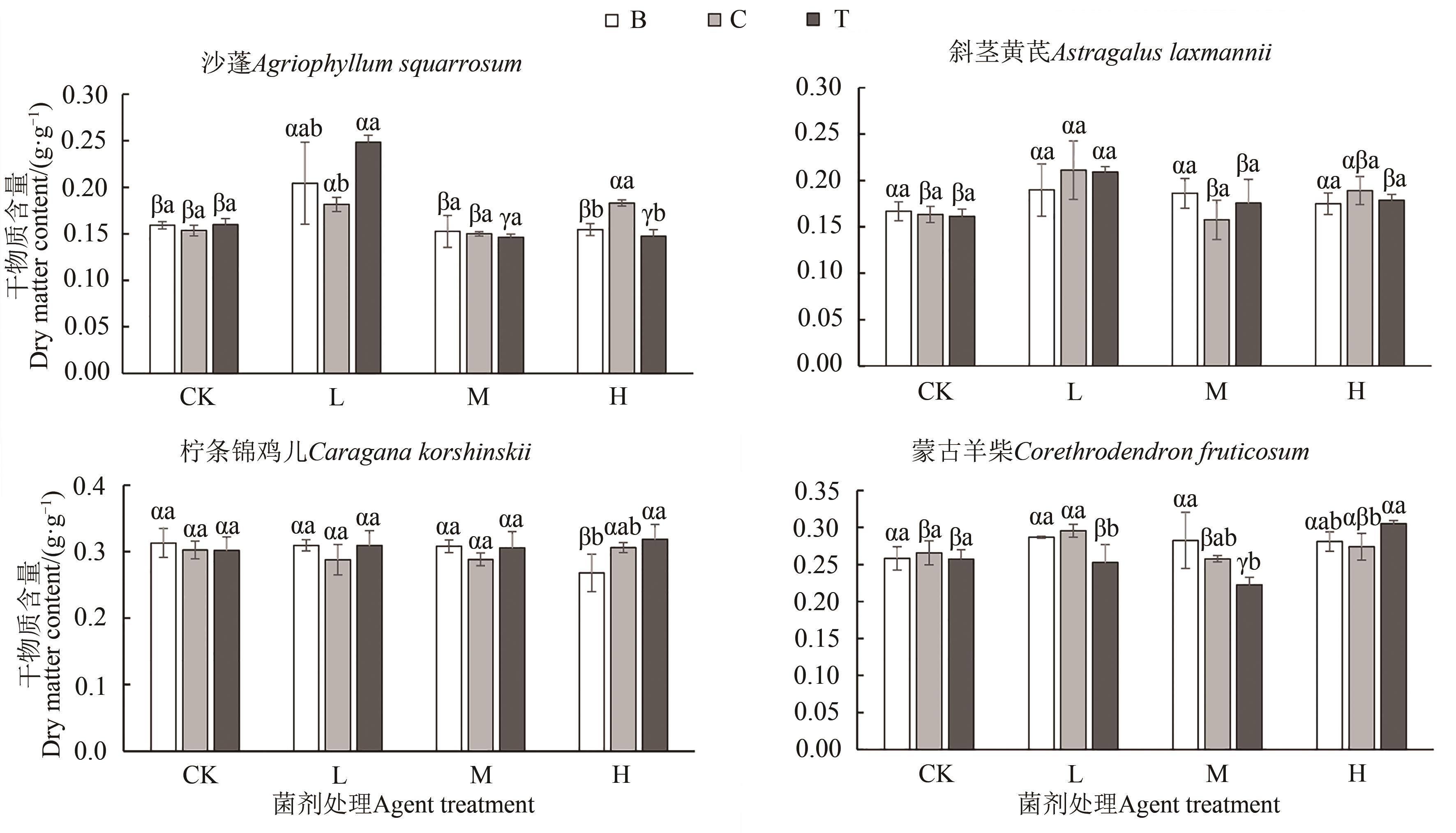 Fig. 5 Dry matter content in leaves under different microbial agent levels and consolidation layer positionsNote: Different English letters indicate significant differences between different consolidation layer positions of same agent level at P<0.05 level; different Greece letters indicate significant differences between different agent levels of same consolidation layer position at P<0.05 level.