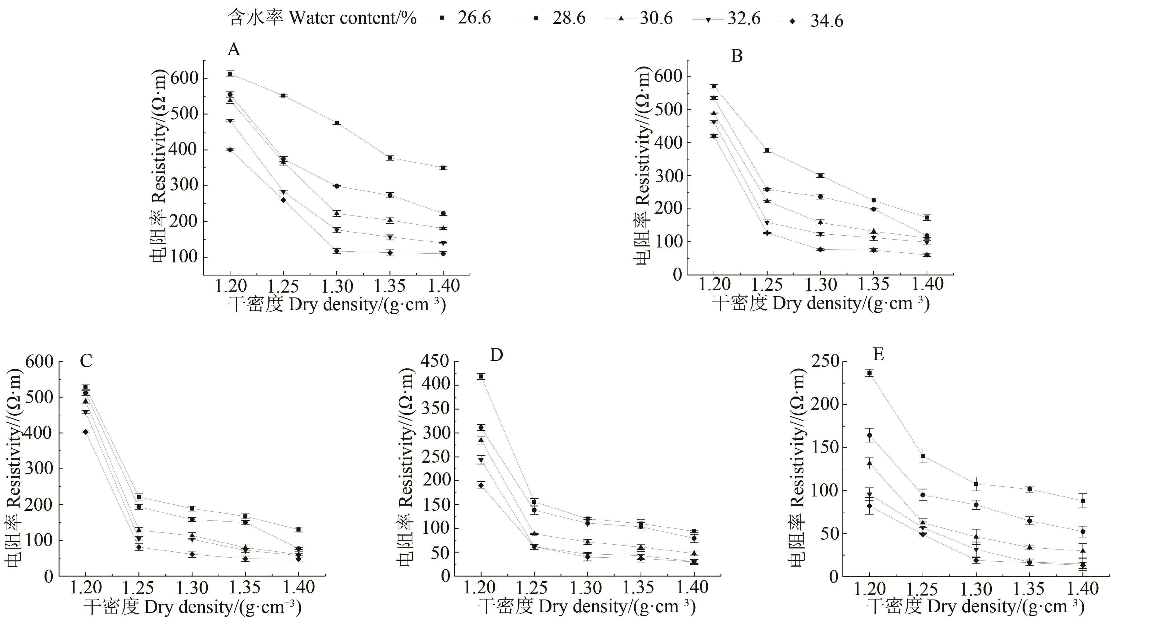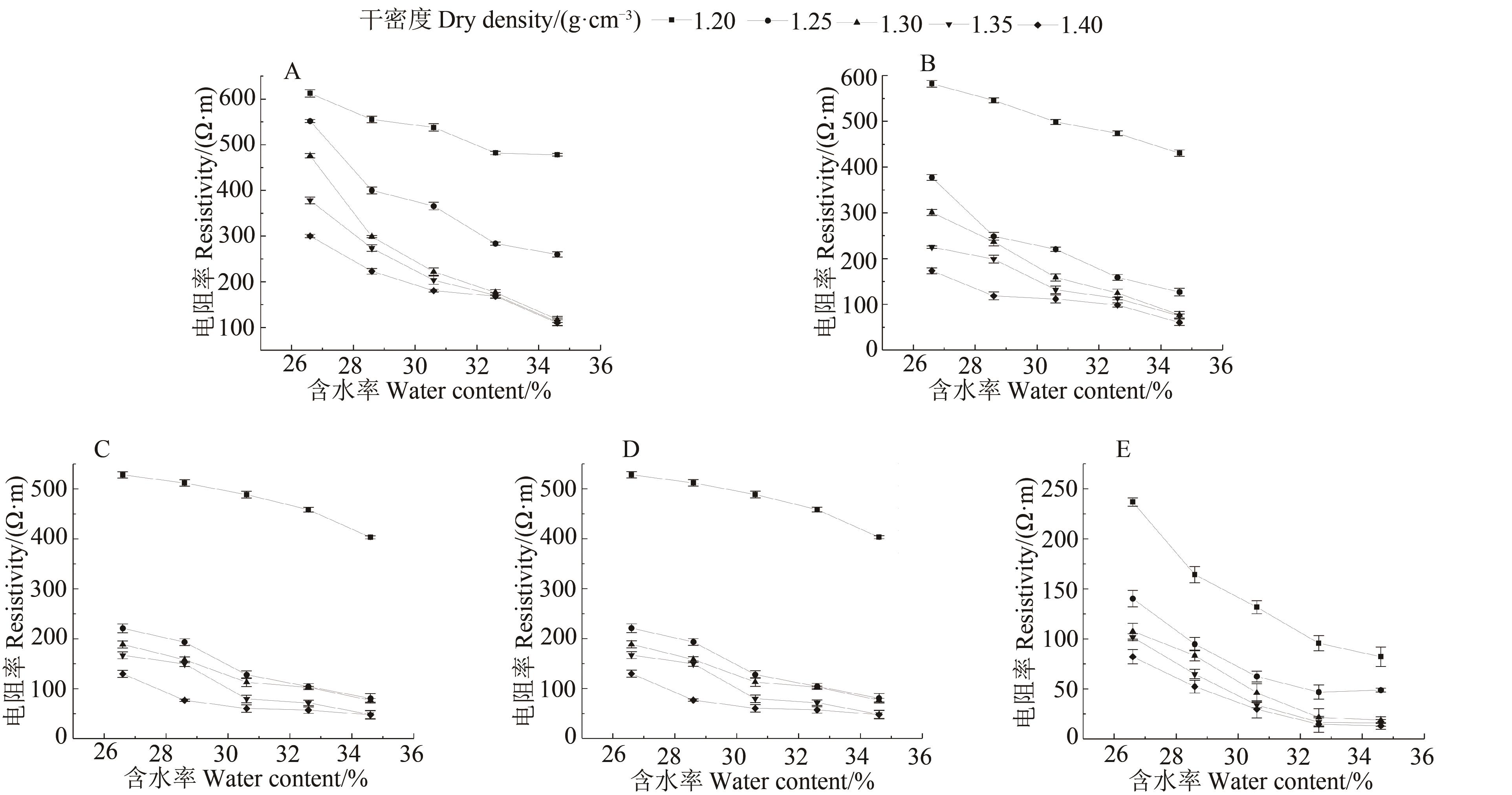 图2 不同镉含量下红黏土电阻率随含水率的变化曲线A:c=0 mg·kg-1; B:c=50 mg·kg-1; C: c=100 mg·kg-1; D: c=150 mg·kg-1; E: c=200 mg·kg-1