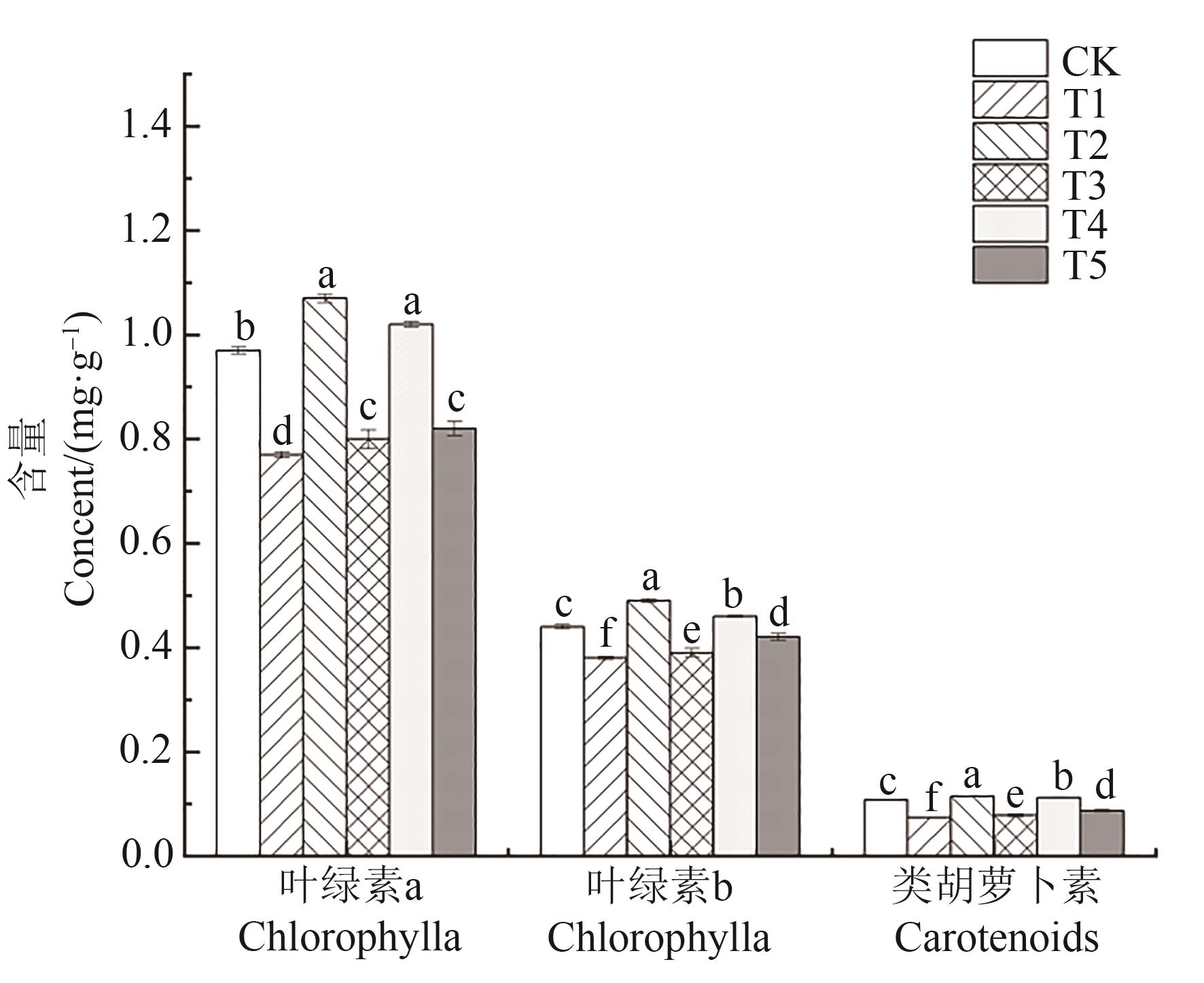 Fig. 2 Photosynthetic pigment content of tobacco plants under different treatmentsNote: Different lowercase letters in same index indicate significant differences between different treatments at P<0.05 level.