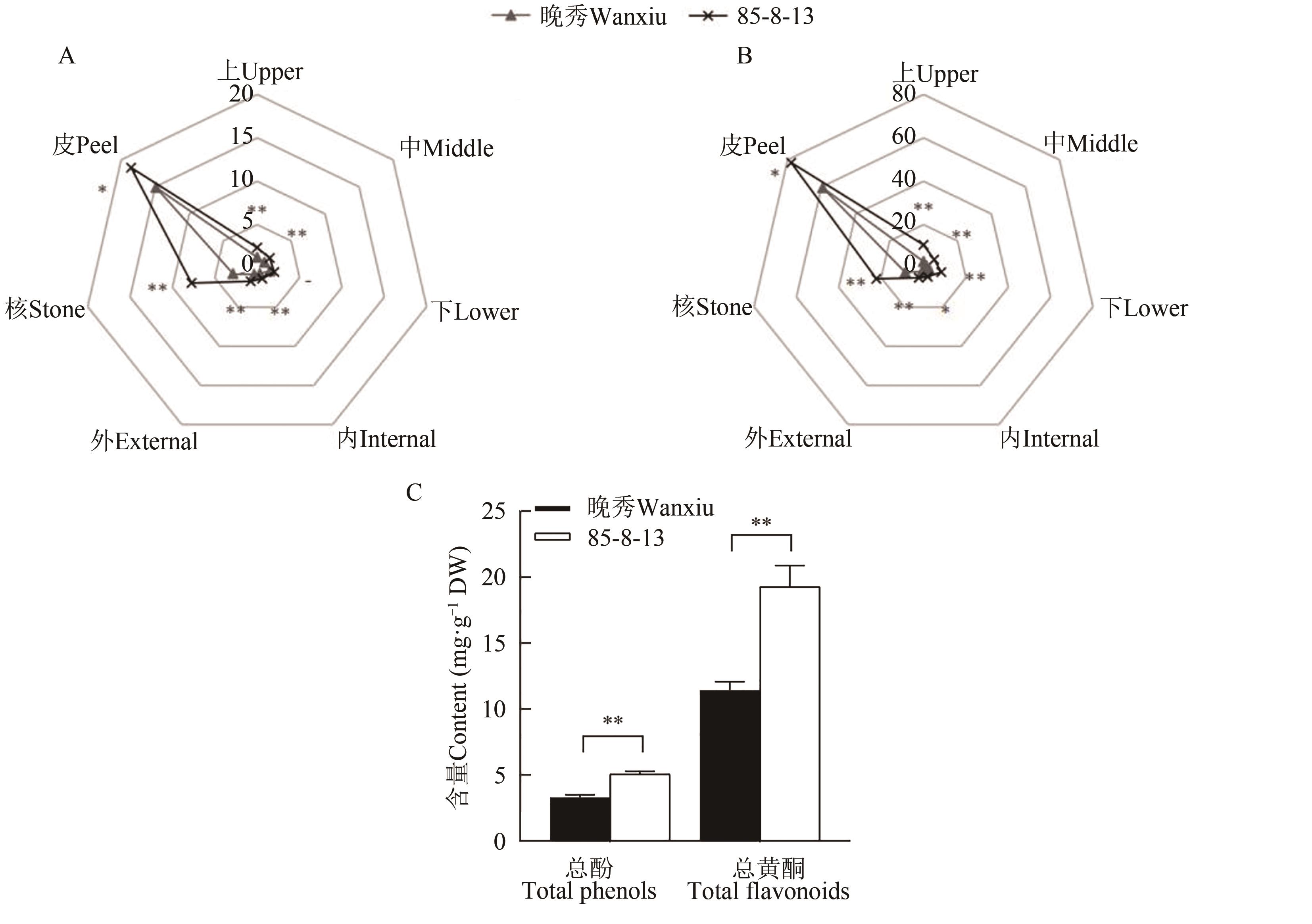 图1 梨果实不同部位的总酚、总黄酮含量A:总酚;B:总黄酮;C:不同梨品种间总酚、总黄酮含量。*和**分别表示不同品种间在P<0.05和P<0.01水平差异显著。