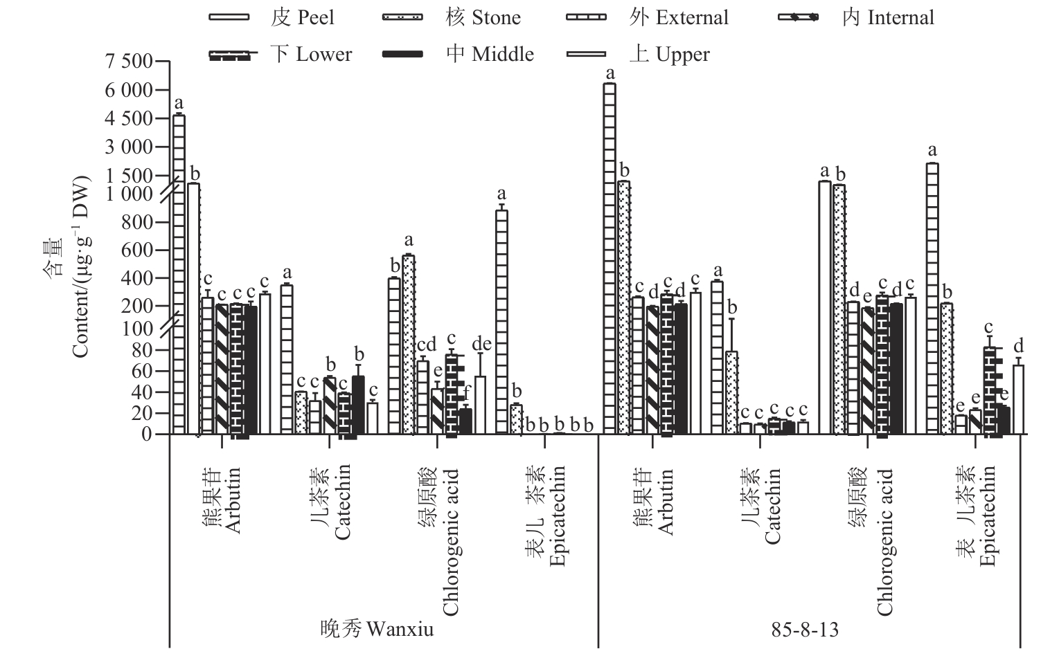 图2 梨果实不同部位4种主要酚类物质的含量注:不同小写字母表示不同部位间在P<0.05水平差异显著。