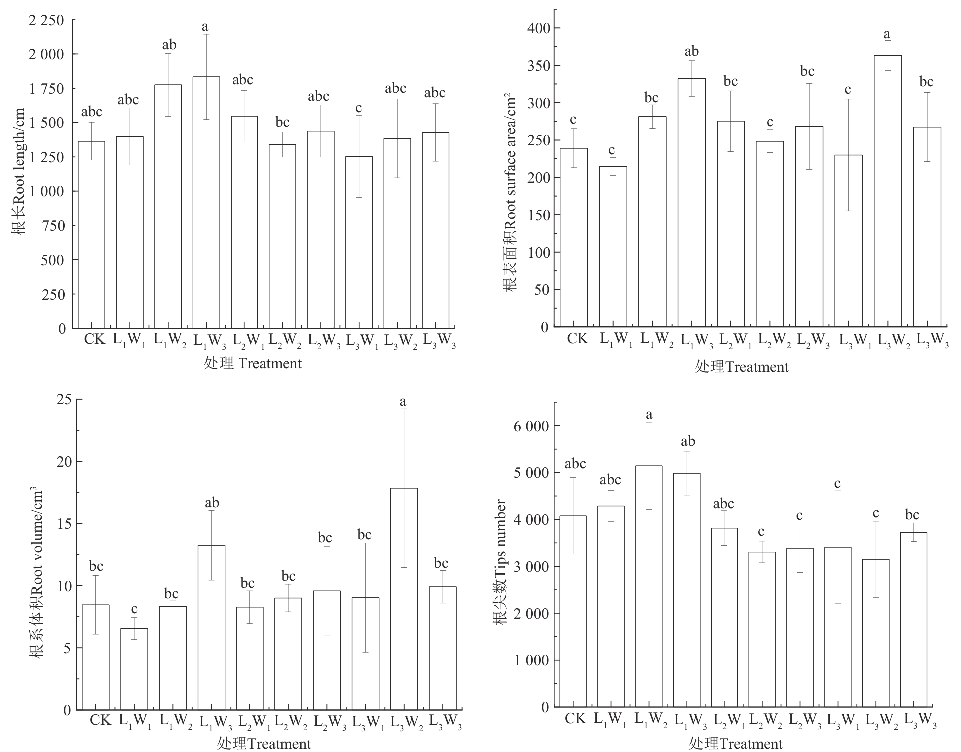 Fig. 1 Root morphology characteristics of cucumber seedlings under different treatmentsNote: Different lowercase letters indicate significant differences between different treatments at P<0.05 level.