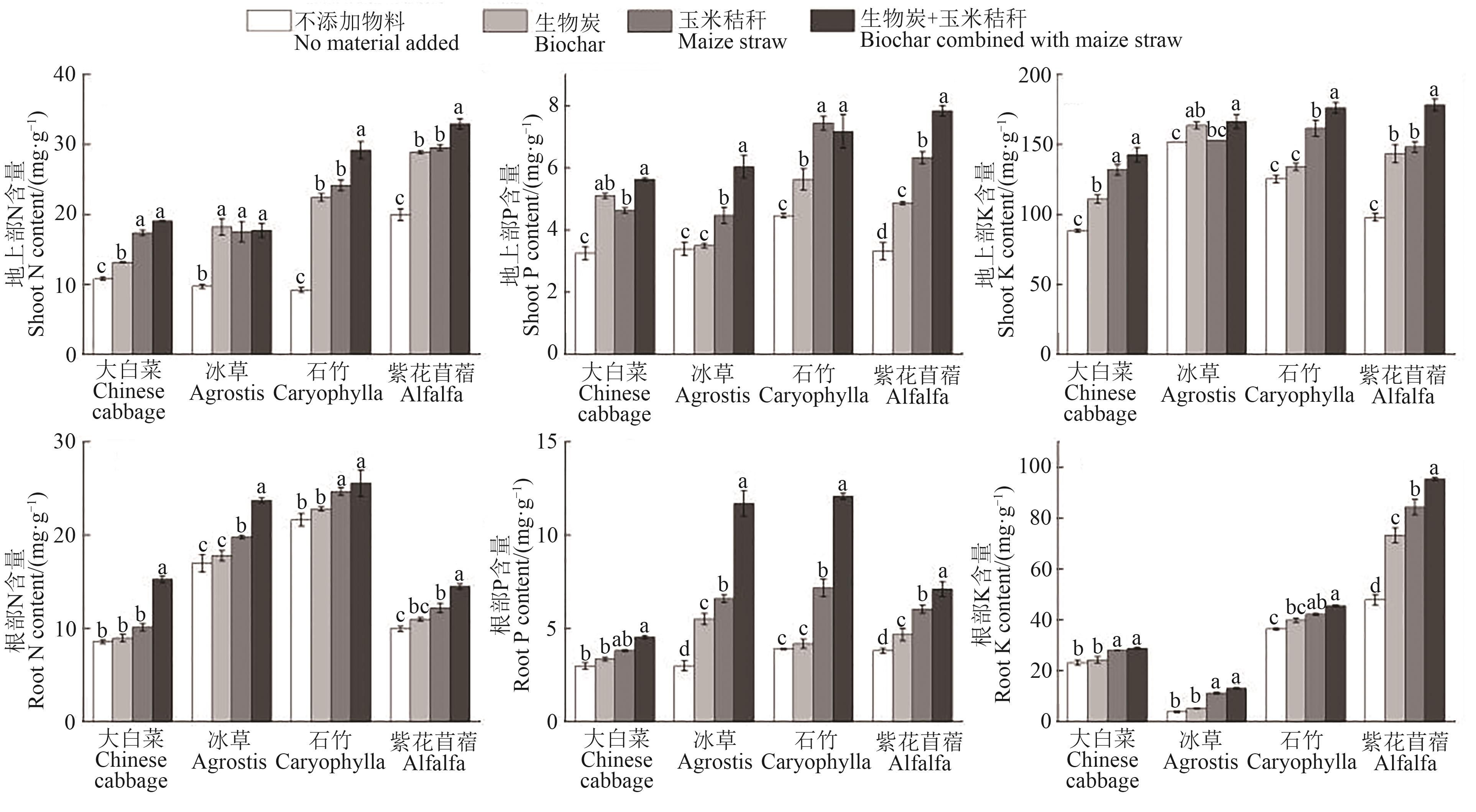 生物炭和玉米秸秆具有改良土壤质量、促进作物生长的作用,其改良效果因物种不同而存在差异,探究不同作物生长性状和养分吸收效率对生物炭和玉米秸秆的响应差异对农业生产具有实践意义。以大白菜、冰草、石竹和紫花苜蓿4种不同科属的作物为材料,采用盆栽试验,分别设置不添加物料、添加生物炭、添加玉米秸秆、生物炭与玉米秸秆配施处理,分析不同处理下土壤养分变化、作物生长和养分吸收的变化规律。结果表明,生物炭、玉米秸秆以及二者配施影响了土壤养分(全氮、有效磷、速效钾和有机碳)含量,变化幅度分别在-28.78%~40.41%、-17.85%~53.20%、-3.45%~62.51%。生物炭与玉米秸秆配施影响了4种作物的生长,其中,地上部干重增加23.74%~80.89%。生物炭、玉米秸秆以及二者配施使根长分别增加22.51%~77.91%、25.86%~80.45%和45.93%~149.24%,养分吸收效率分别提高3.40%~143.73%、1.07%~188.80%和9.82%~290.32%。施用生物炭和玉米秸秆对4种作物的生长均有明显的改善,生物炭和玉米秸秆增加了土壤养分,促进了作物养分吸收,促进了作物地上部和根部的生长。研究结果为生物炭和秸秆的广泛利用和推广提供了理论基础。