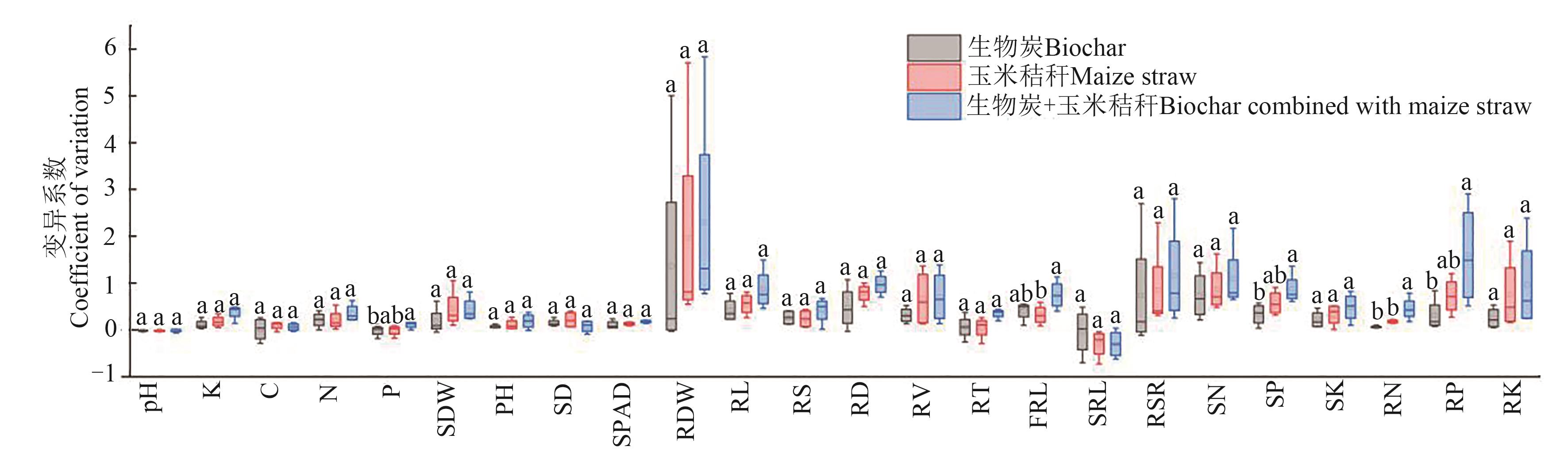 图5 土壤pH、养分含量及作物生长性状在外施物料下的变异系数注:同一作物性状中不同小写字母表示不同处理间变异系数在P<0.05水平差异显著。pH—土壤pH;K—速效钾;C—土壤有机碳;N—全氮;P—有效磷;SDW—地上部干重;PH—株高;SD—茎粗;SPAD—叶绿素;RDW—根部干重;RL—根长;RS—根表面积;RD—根直径;RV—根体积;RT—根尖数;FRL—细根长;SRL—比根长;RSR—根冠比;SN—地上部N含量;SP—地上部P含量;SK—地上部K含量;RN—根部N含量;RP—根部P含量;RK—根部K含量。