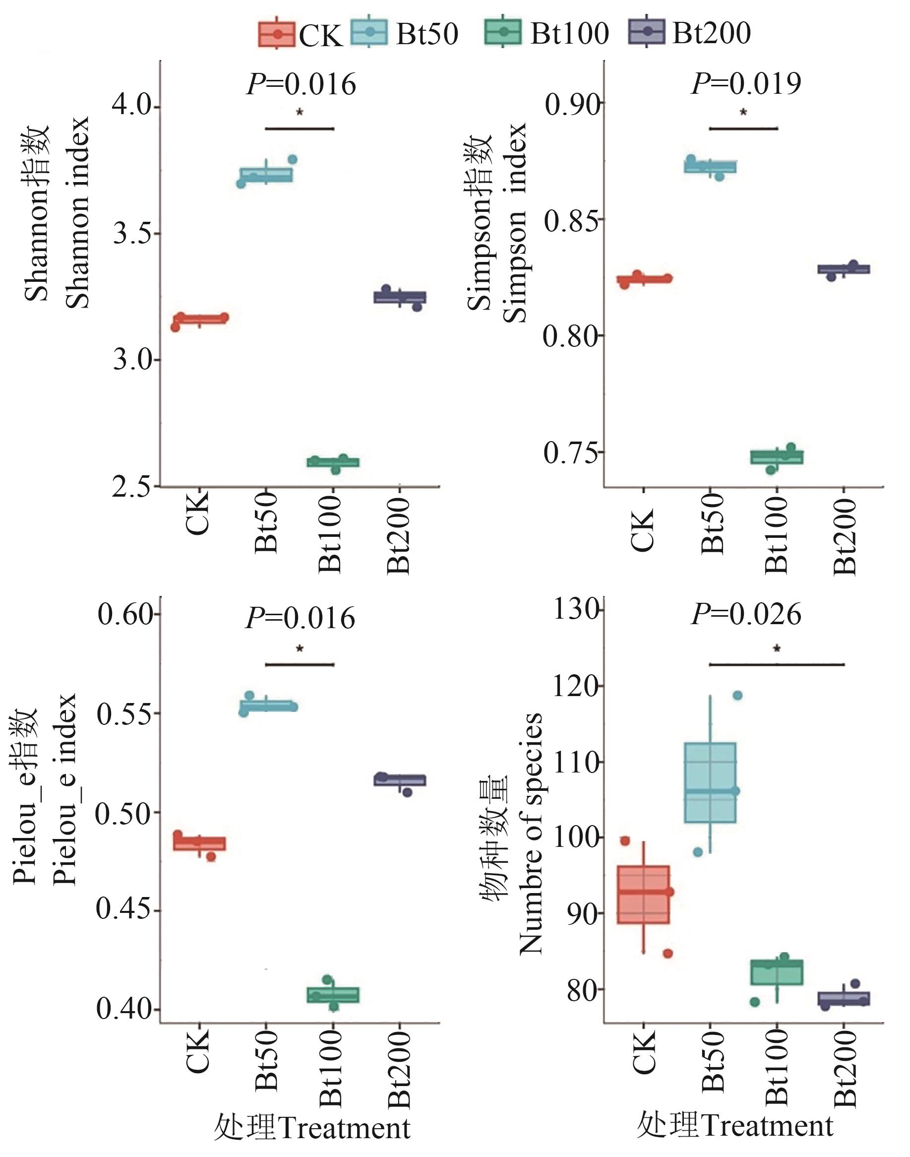 图3 不同处理茶尺蠖幼虫肠道细菌的Alpha多样性指数注:*表示在P<0.05水平显著。