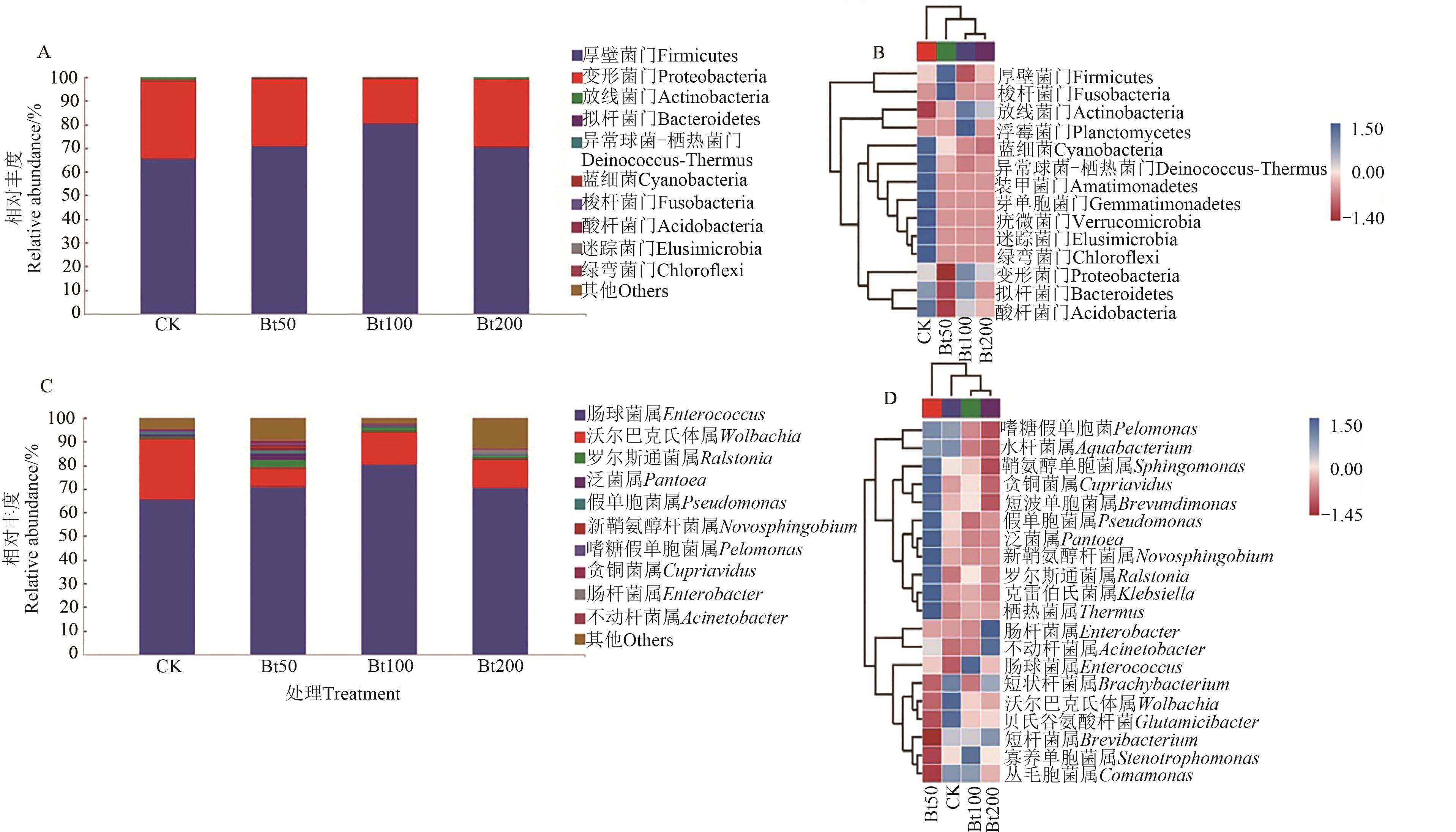 图5 不同Bt处理茶尺蠖肠道细菌种群的组成和丰度A~B:门水平;C~D:属水平