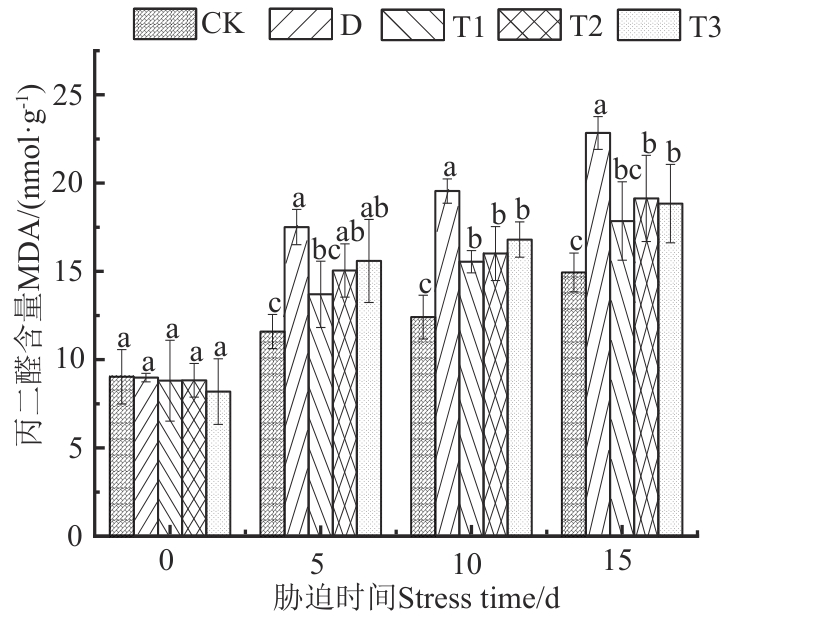 Fig. 2 MDA content of flue-cured tobacco under different treatmentsNote: Different lowercase letters indicate significant differences between different treatments of same time at P<0.05 level.