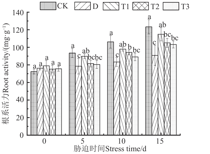 Fig. 3 Root vitality of flue-cured tobacco under different treatmentsNote:Different lowercase letters indicate significant differences between different treatments of same time at P<0.05 level.