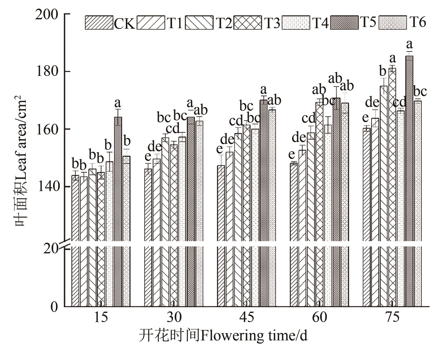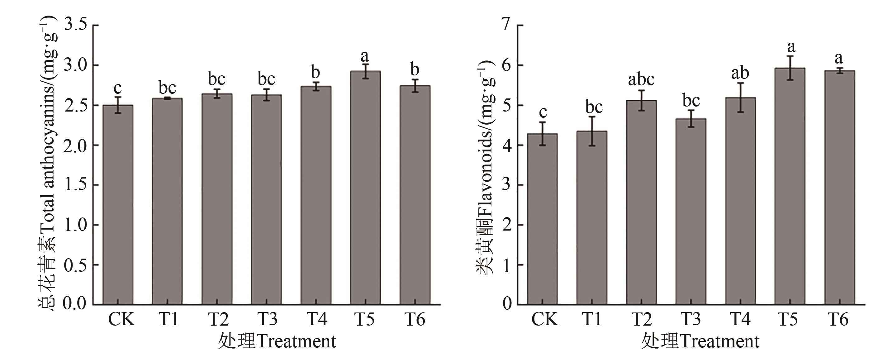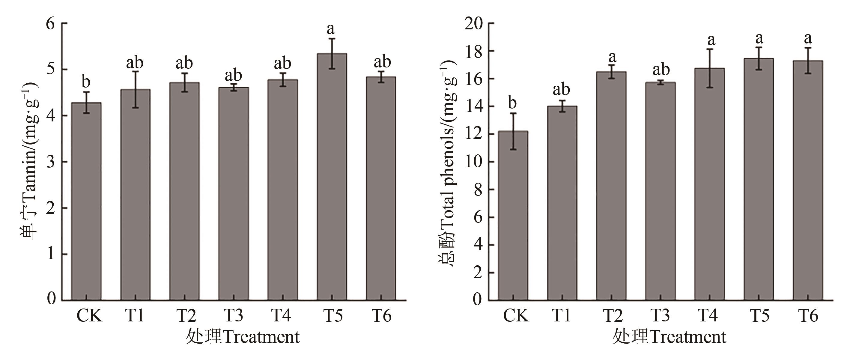 为探究不同叶面肥对‘黑比诺’葡萄生长发育和果实品质的影响,以5年生‘黑比诺’葡萄为试材,分别喷施无机营养型(T1)、氨基酸型(T2)、激素型(T3)、大量元素水溶型(T4)、腐殖酸型(T5)、抗性诱导型(T6)叶面肥,以喷施清水为对照(CK),分析不同时期葡萄植株叶面积、新梢基部粗度、叶片SPAD值、矿质元素含量变化,并对成熟期果实的品质进行测定。结果表明,T5处理的叶面积显著增大,在花后15、30、45、60、75 d分别较CK增加14.10%、12.34%、15.47%、15.27%、15.70%。叶面肥处理均增加了葡萄植株的新梢基部粗度,其中T5处理效果最佳。与CK相比,各处理不同时期的叶片SPAD值均有所提高,但差异不显著。对矿质元素含量测定结果表明,T1处理叶片中的大量元素含量显著提高,其中K含量的增幅最大;T6处理对中量元素的提升效果最佳;T5处理对微量元素的积累效果较好,且在花后60和75 d时叶片中的Cu含量显著增加。在果实品质方面,T5处理葡萄果实中的花青素、类黄酮、单宁、总酚含量分别较CK显著提高16.88%、38.38%、24.74%、43.13%。对采收期葡萄的果实品质相关指标进行主成分分析表明,T5处理的得分最高。综上,6种不同类型叶面肥对‘黑比诺’葡萄植株的生长与果实品质均起促进作用,其中腐殖酸型叶面肥效果最优,能显著改善果实品质。以上研究结果为葡萄提质增产提供理论指导。