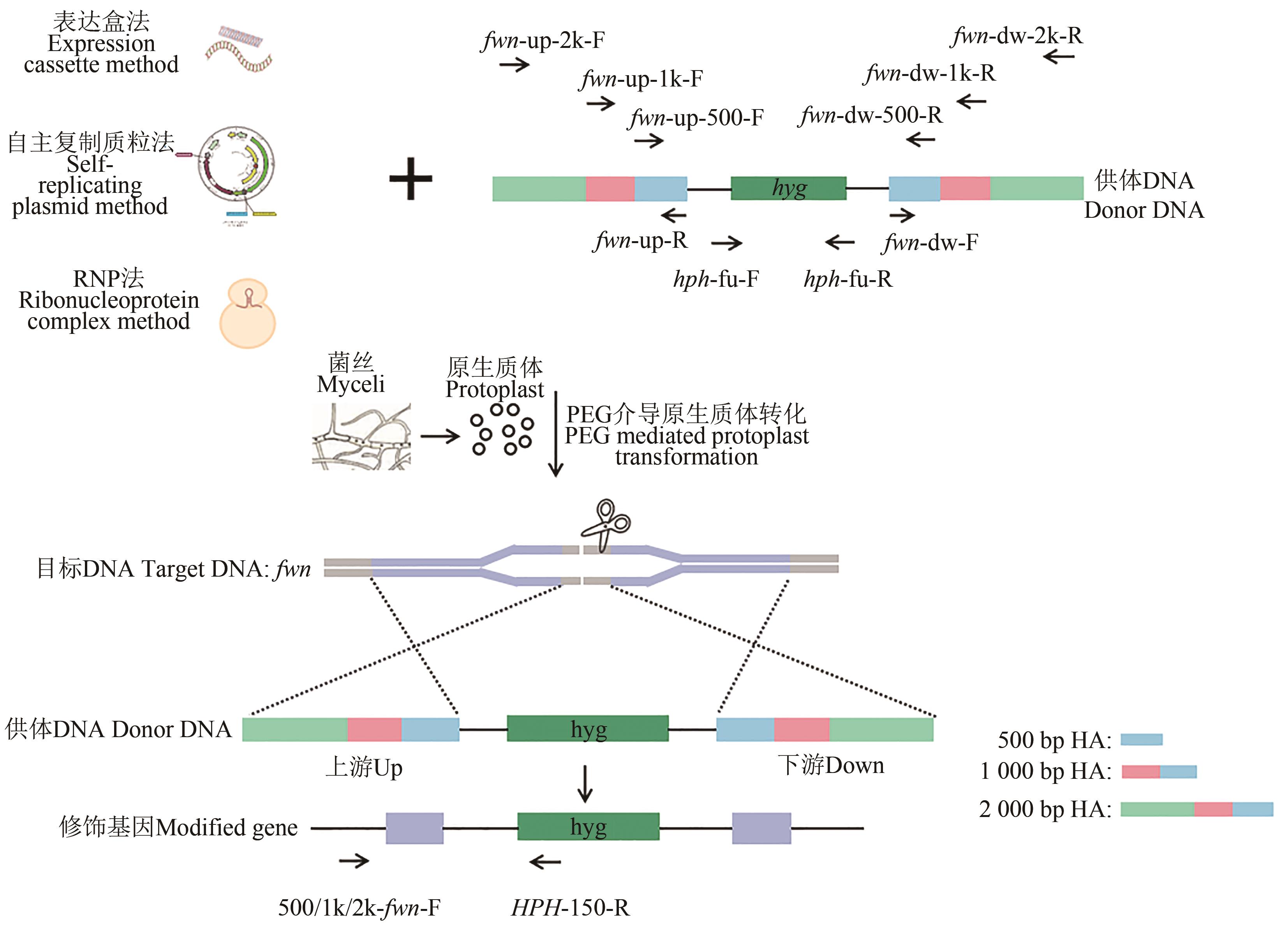Aspergillus tubingensis is a filamentous fungus with broad application prospects in feed, food, biological control, environmental restoration and so on. Combining morphological observation with molecular detection, Ehrlich reagent staining, a strain of Aspergillus tubingensis was successfully identified and was named as F316. In order to explore a suitable gene editing method for F316 and facilitate genetic engineering modification, CRISPR/Cas9 was applied to insert hygromycin resistance genes into the spore pigment synthesis related gene fwnA. Through spore color statistics and resistance gene PCR verification, the effects of different delivery methods of Cas9 and gRNA on homologous recombination efficiency were compared. The results showed that, for F316 strain, the homologous recombination efficiency of expression cassette method, self-replicating plasmid method and ribonucleoprotein complex (RNP) method were 70.14%, 66.67% and 25.70%, respectively. In addition, the length of homologous arms in donor DNA also affected the homologous recombination efficiency. When the length of homologous arms was 2 000 bp, the recombination efficiency was the best.