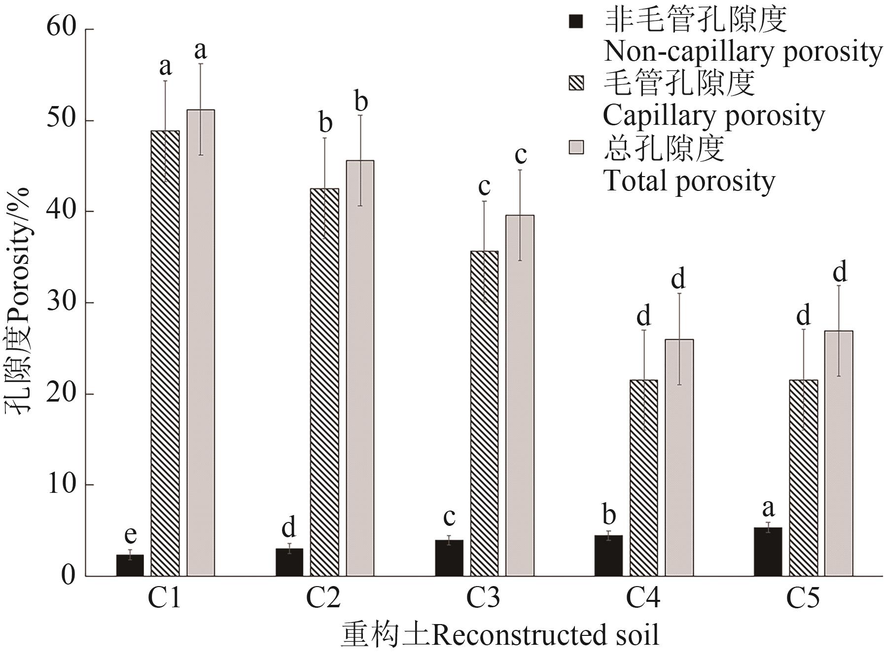 Fig. 2 Porosity of different reconstructed soilsNote:Different small letters indicate significant differences between different treatments at P<0.05 level.