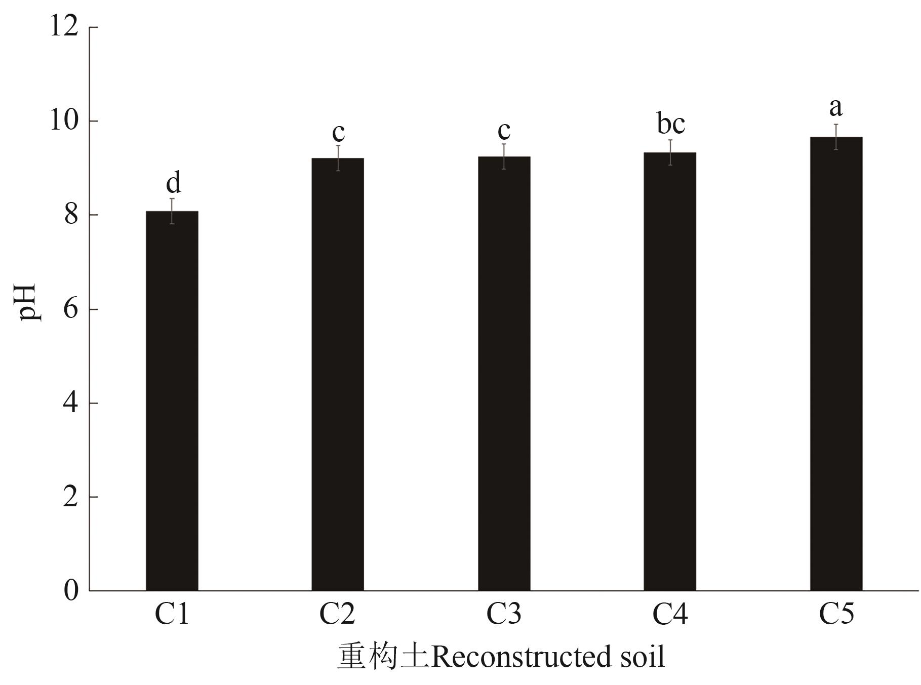 Fig. 4 PH of different reconstructed soilsNote:Different small letters indicate significant differences between different treatments at P<0.05 level.