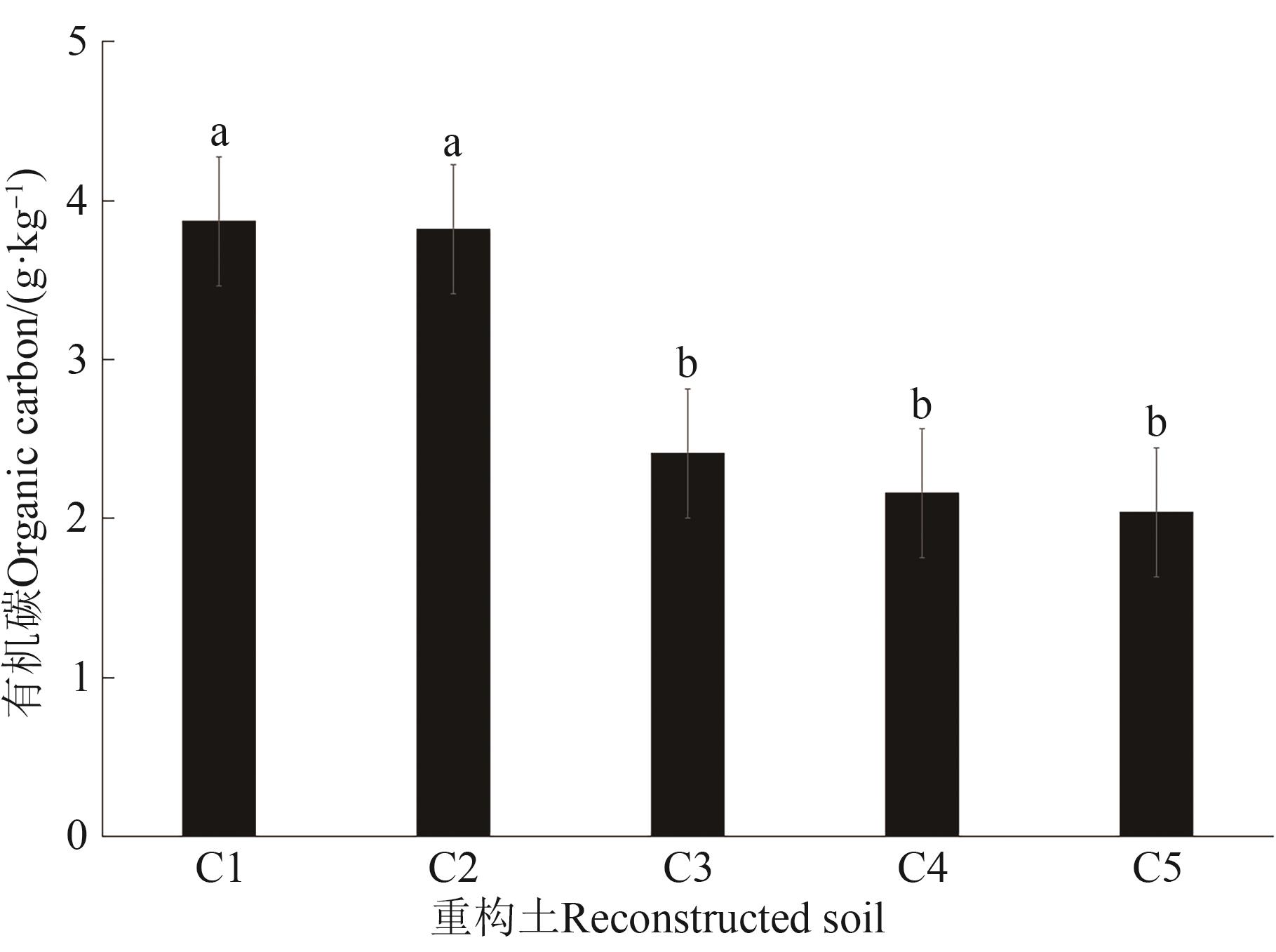 Fig. 5 Organic carbon content of different reconstructed soilsNote:Different small letters indicate significant differences between different treatments at P<0.05 level.